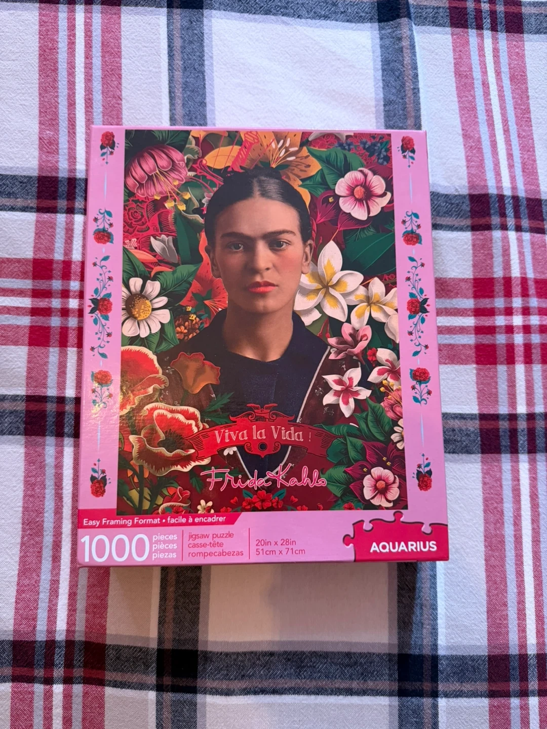 This is a 1000-piece jigsaw puzzle featuring Frida Kahlo's "Viva la Vida" artwork by Aquarius. It measures 20in x 28in (51cm x 71cm). It's a fun challenge for puzzle enthusiasts and art lovers alike! Includes all pieces.