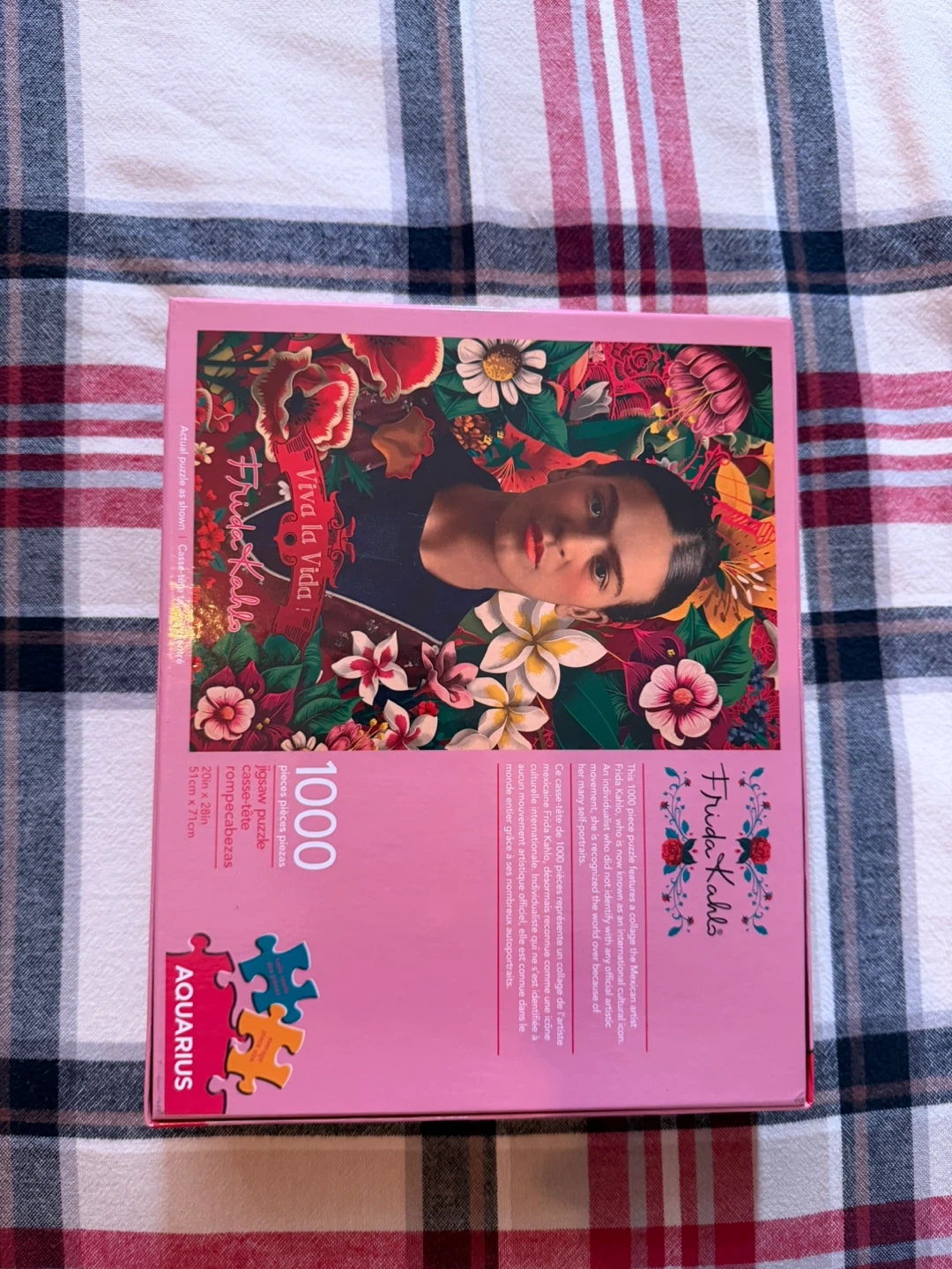 This is a 1000-piece jigsaw puzzle featuring Frida Kahlo's "Viva la Vida" artwork by Aquarius. It measures 20in x 28in (51cm x 71cm). It's a fun challenge for puzzle enthusiasts and art lovers alike! Includes all pieces.