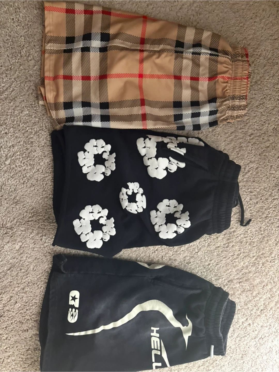 Three pairs of sweatpants, including one with a tan plaid pattern, one black pair with white floral designs, and one black pair with white graphics. All appear to be size medium and made of comfortable material.