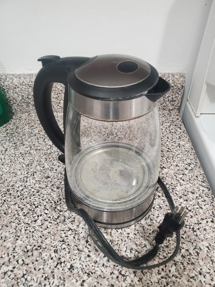 Glass electric kettle with stainless steel accents. Includes a cord.