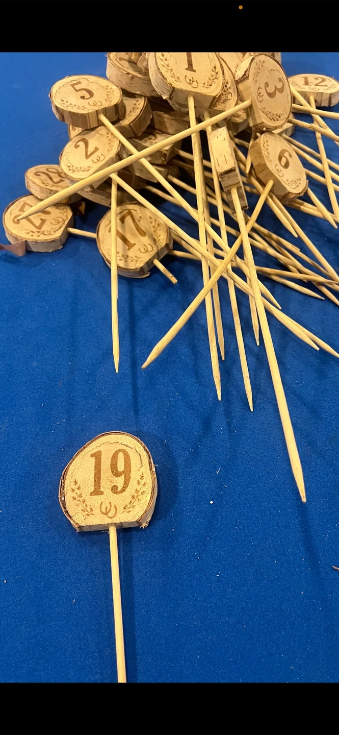 A set of numbered table markers, crafted from wood slices with numbers burned in. Each marker has a unique number from 1 up to at least 20. They're perfect for numbering tables at events like weddings or parties. They provide a rustic touch to your decor!