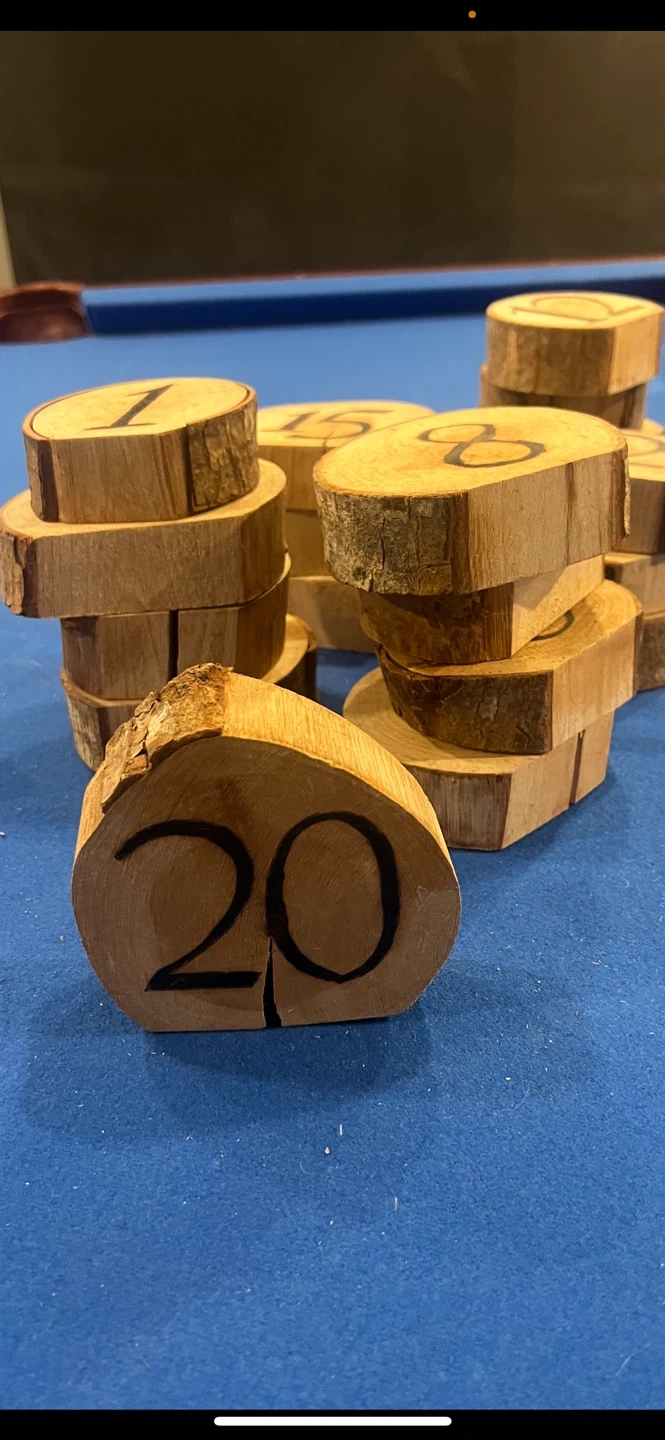 A set of numbered table markers, crafted from wood slices with numbers burned in. Each marker has a unique number from 1 up to at least 20. They're perfect for numbering tables at events like weddings or parties. They provide a rustic touch to your decor!