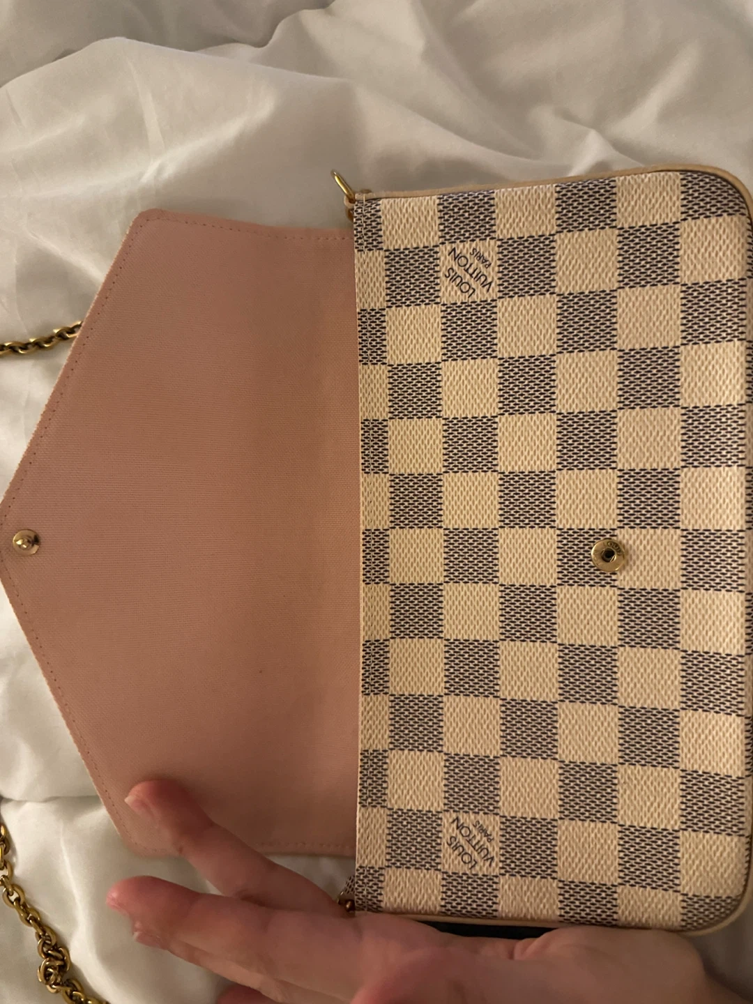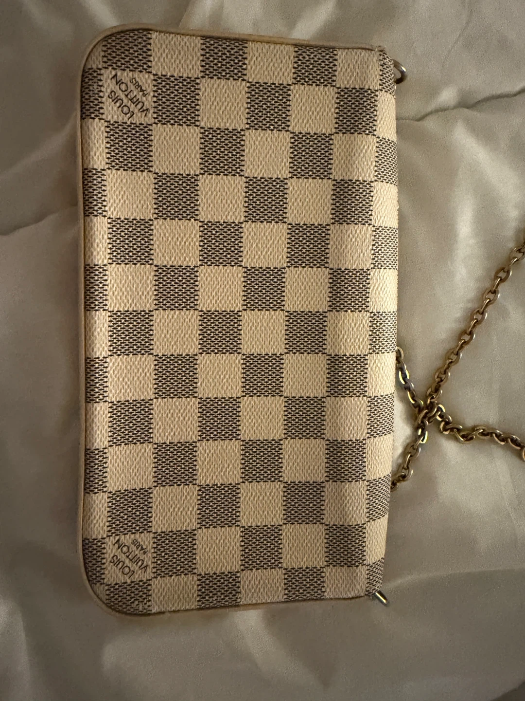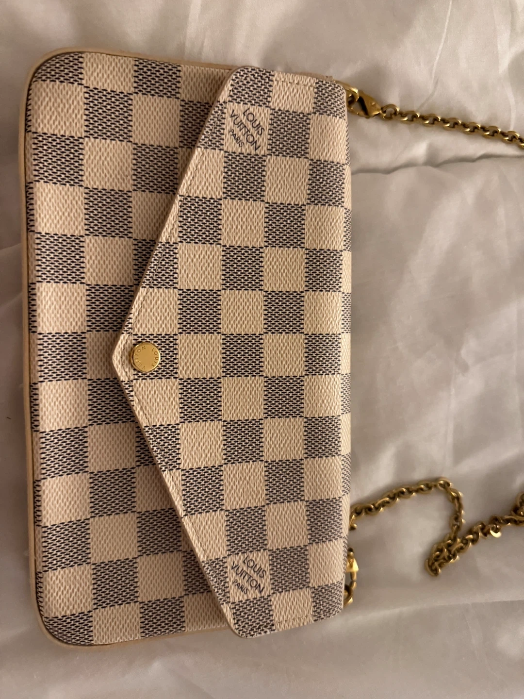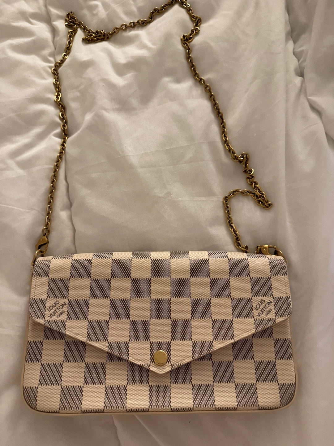 Selling an authentic Louis Vuitton Damier Azur Pochette Felicie. It's in great condition and ready for a new owner!