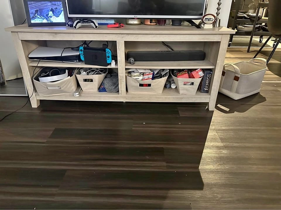 Solid wood TV stand with storage. Perfect for living rooms or bedrooms. Dimensions: 48" W x 16" D x 20" H. Minor wear and tear, but overall in good condition.