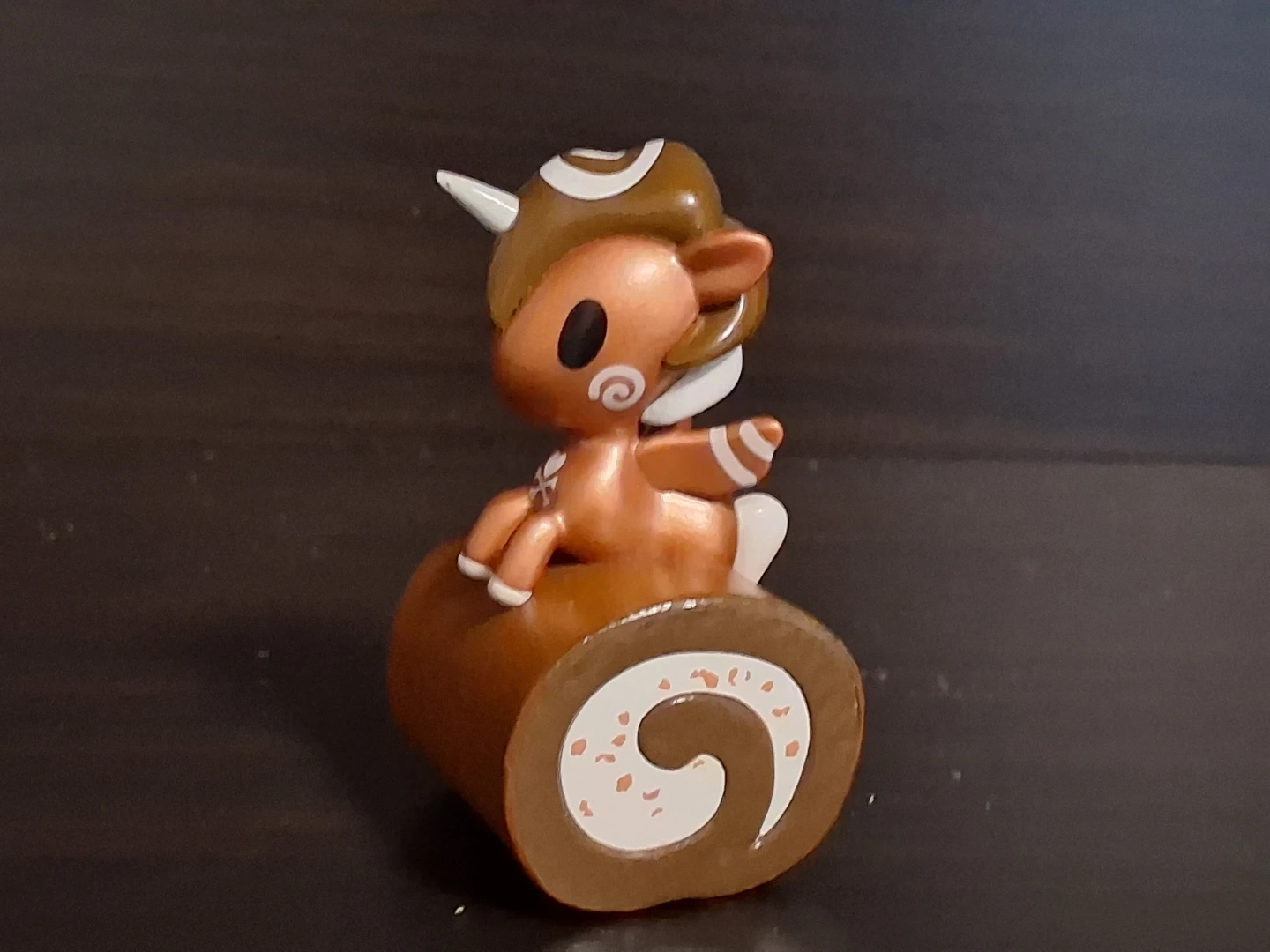 This is a Tokidoki Unicorno figurine. It's designed to look like a unicorn sitting on a chocolate Swiss roll with cream filling. The figurine is a shiny copper colour with white and brown accents.