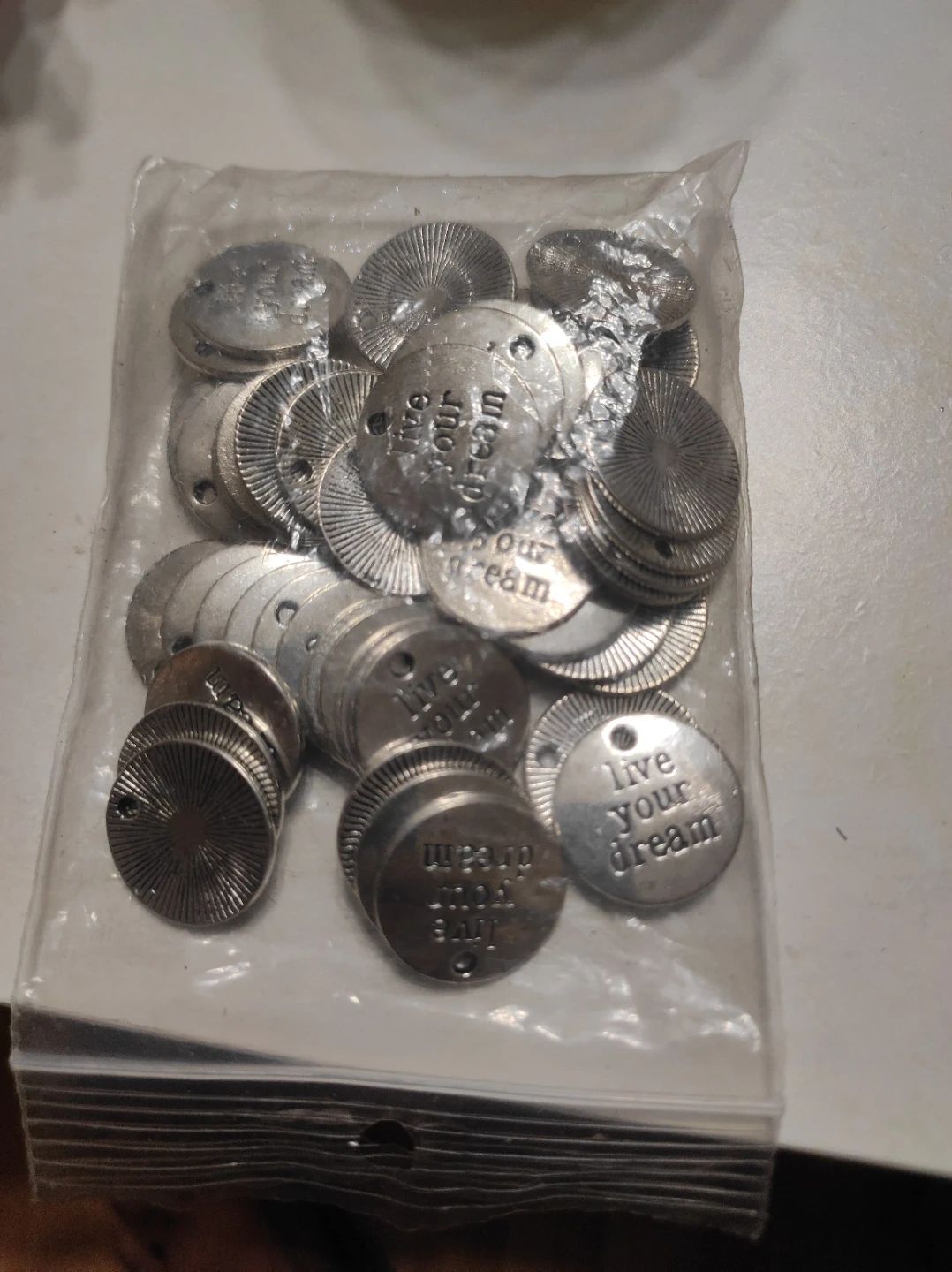 This is a bag of antique silver-toned charms with the phrase 'live your dream' engraved on them. They're perfect for jewelry making or other craft projects.