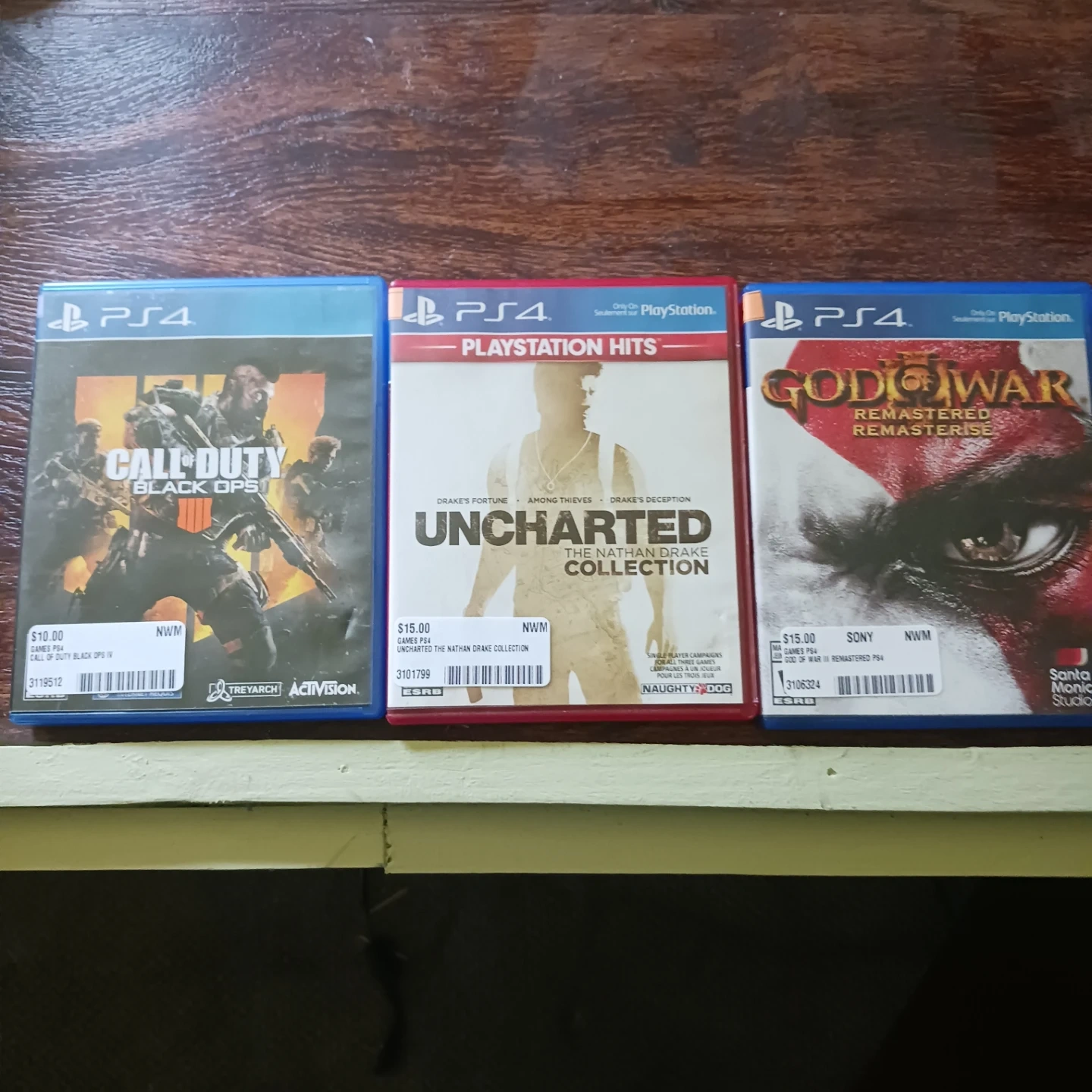 This is a bundle of three PlayStation 4 games. It includes Call of Duty: Black Ops IV, Uncharted: The Nathan Drake Collection, and God of War III Remastered. All are for PS4.
