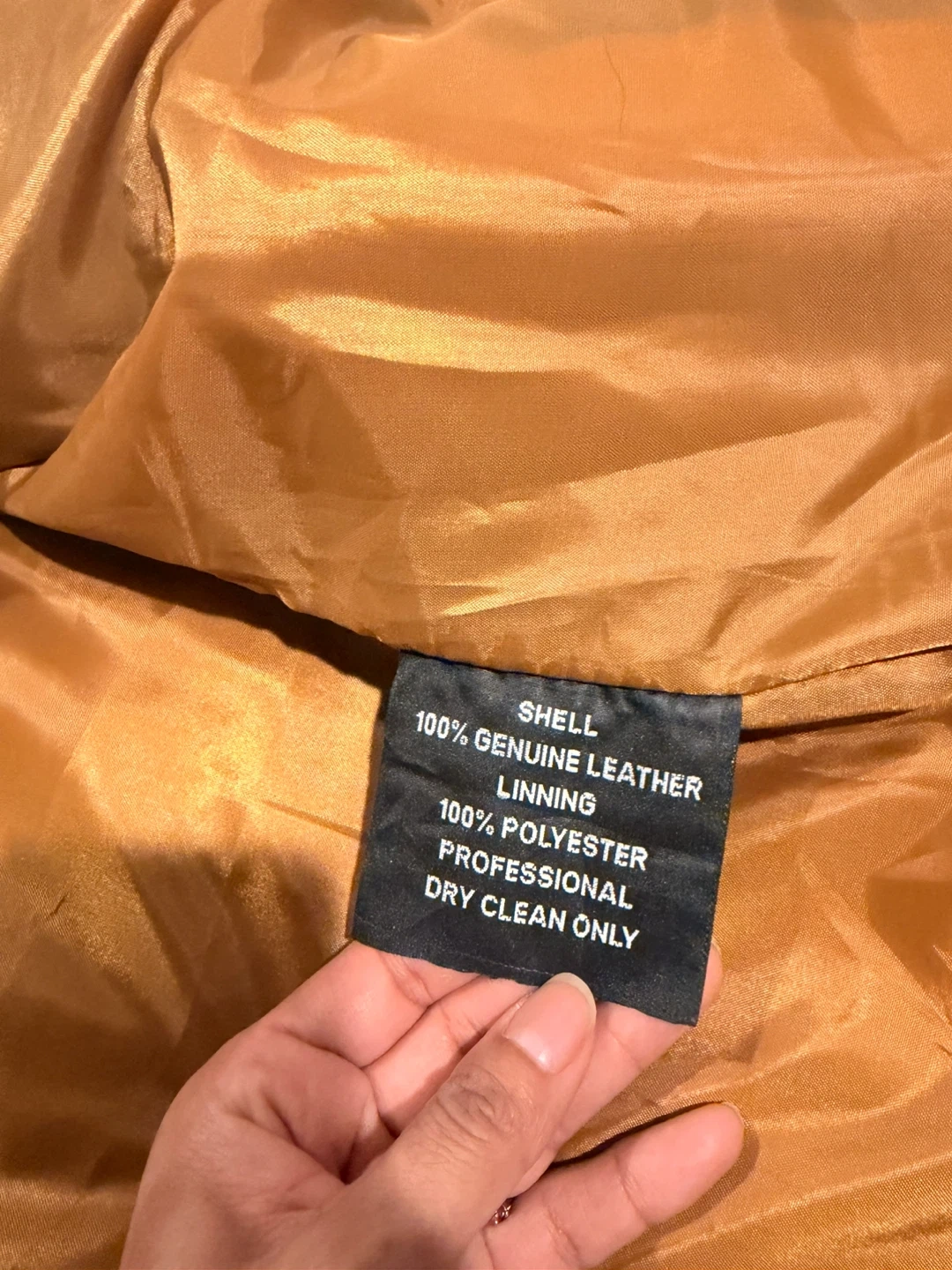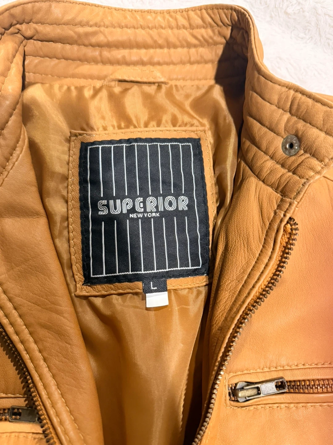 This tan leather jacket by Superior New York is made with 100% genuine leather. The lining is 100% polyester. It's a size large with a professional, stylish design. It requires dry cleaning only.