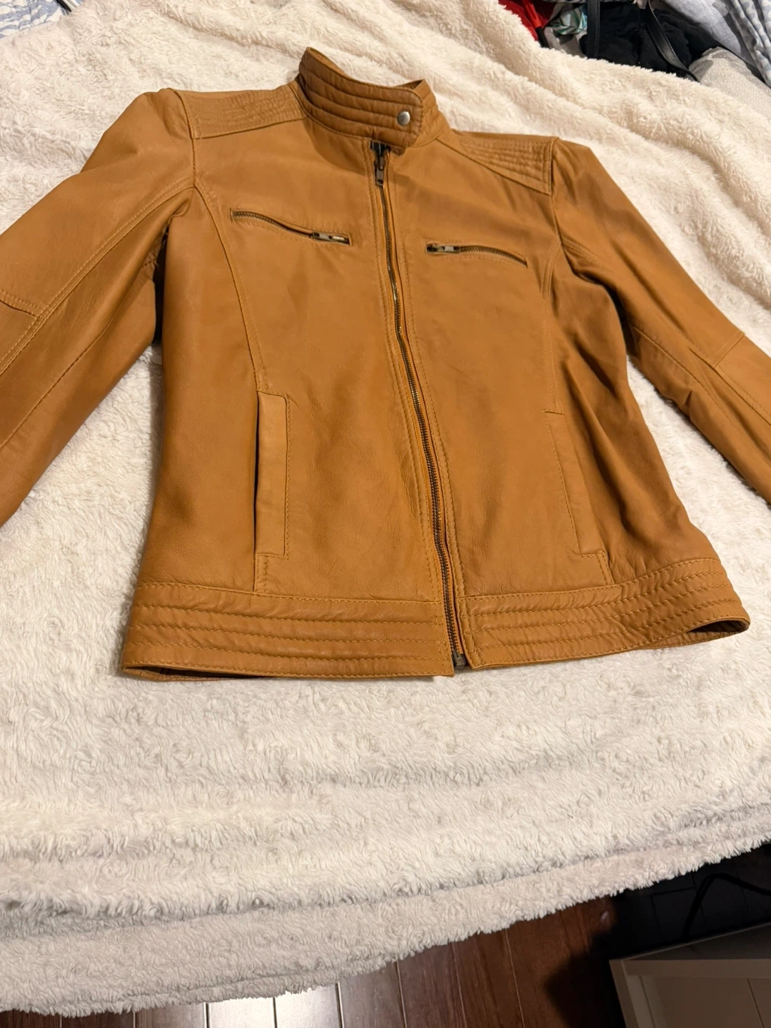 This tan leather jacket by Superior New York is made with 100% genuine leather. The lining is 100% polyester. It's a size large with a professional, stylish design. It requires dry cleaning only.