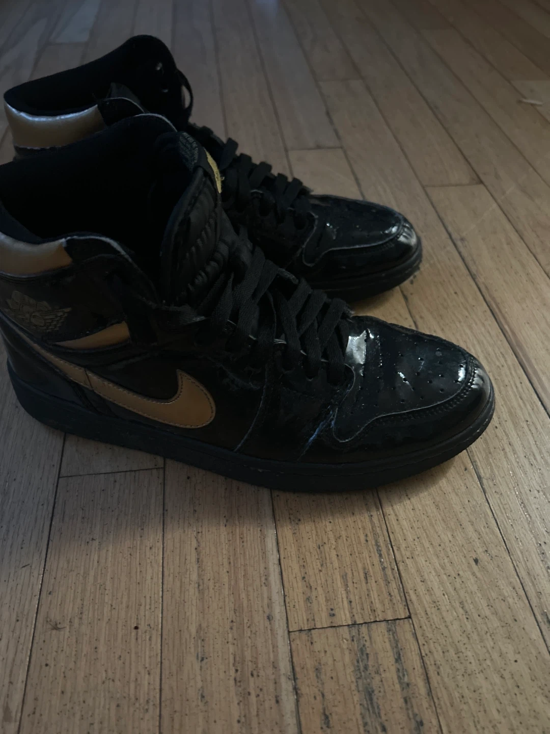 Selling a pair of Nike Air Jordan 1 Mid sneakers in black and gold. They are in used condition, with some signs of wear. Perfect for casual wear or adding to your sneaker collection!