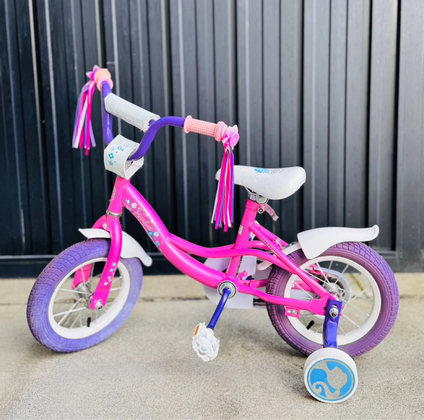 A bright pink children's bicycle with purple accents and decorative streamers on the handlebars. It's equipped with training wheels for stability. The seat features a decorative design. This bike is designed for young riders learning to cycle.