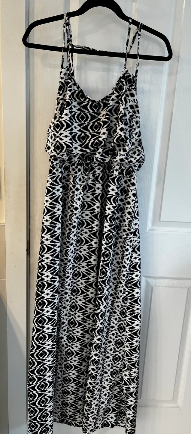 This flowing maxi dress features a black and white tribal-inspired print. It has a flattering elasticated waist and adjustable spaghetti straps. It's a comfortable and stylish option for warmer days!