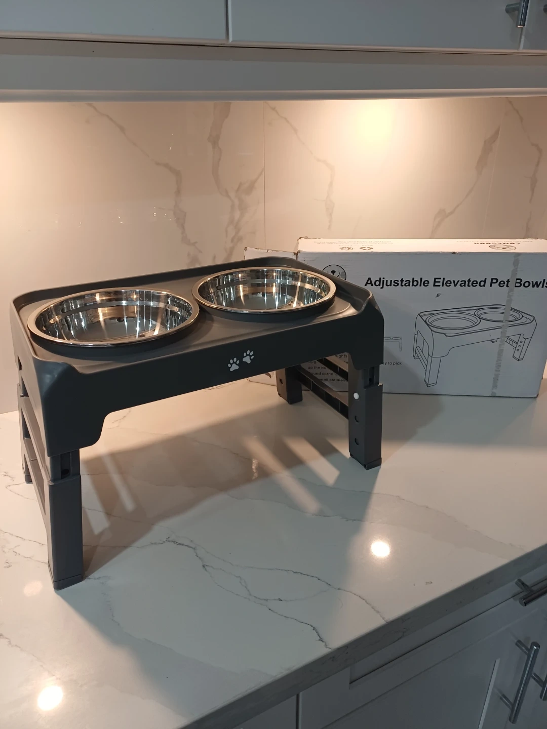 I'm selling a brand new set of COMESOON adjustable elevated pet bowls, still in the box! This set is perfect for pets of all sizes and helps improve their posture while eating. The bowls are made of stainless steel and the stand is a sturdy, adjustable design. It has 4 adjustable heights and upgraded high-low anti-slip strips. Round corners for easy cleaning and thickened stainless steel bowls.