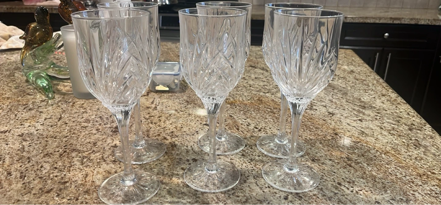 Beautiful crystal wine glasses with intricate diamond cut patterns. Perfect for serving your favourite wines. Adds an elegant touch to any table setting!