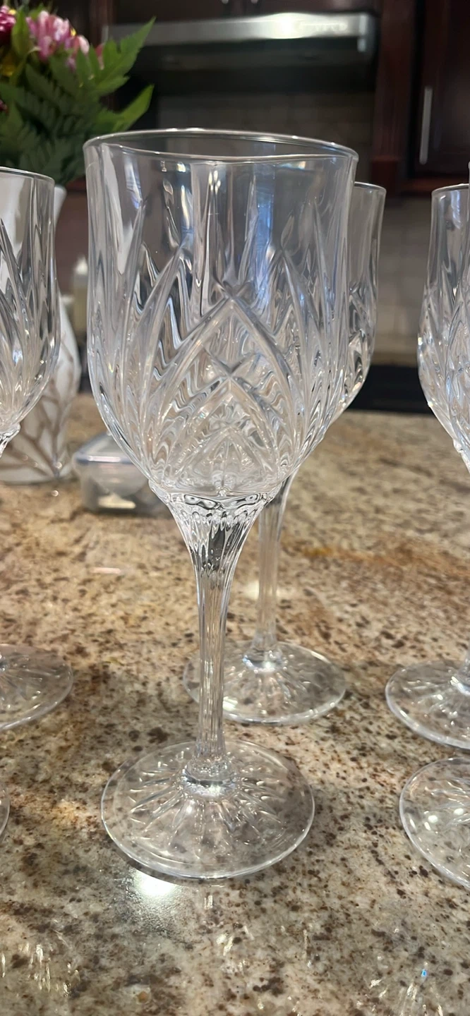 Beautiful crystal wine glasses with intricate diamond cut patterns. Perfect for serving your favourite wines. Adds an elegant touch to any table setting!