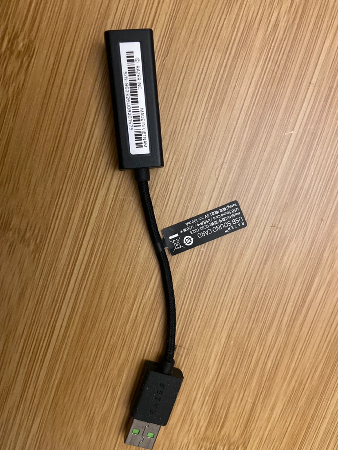 This is a Razer USB Sound Card with model number RC30-0323. It's rated for 5V and 100mA. This device connects via USB and is made in Vietnam. It's useful for enhancing audio output from your computer.