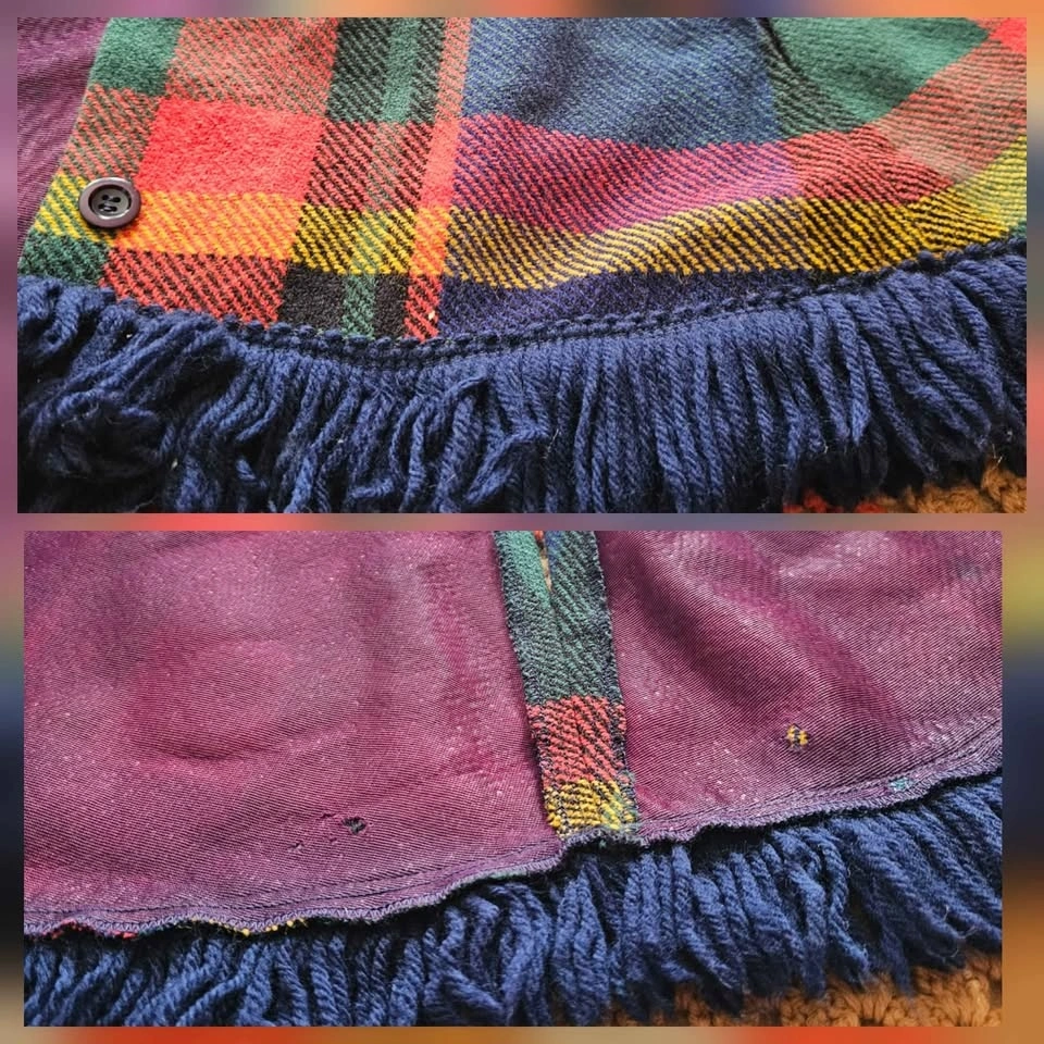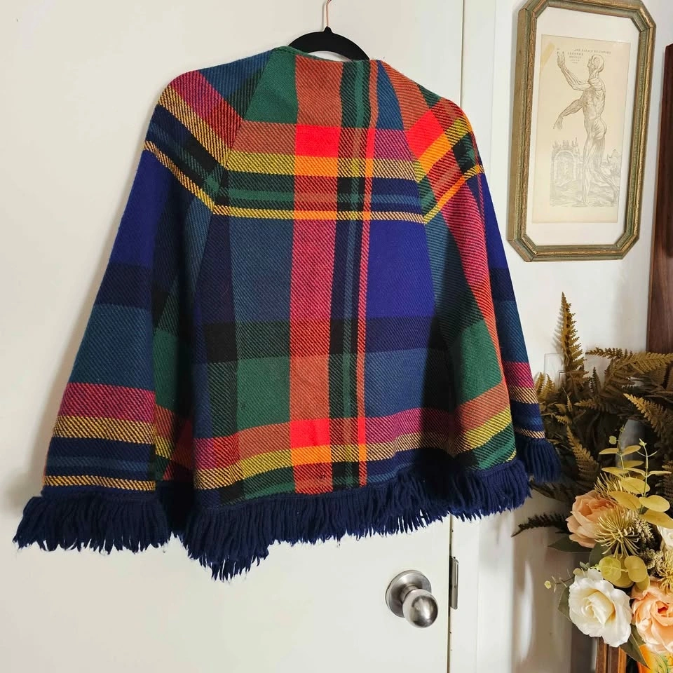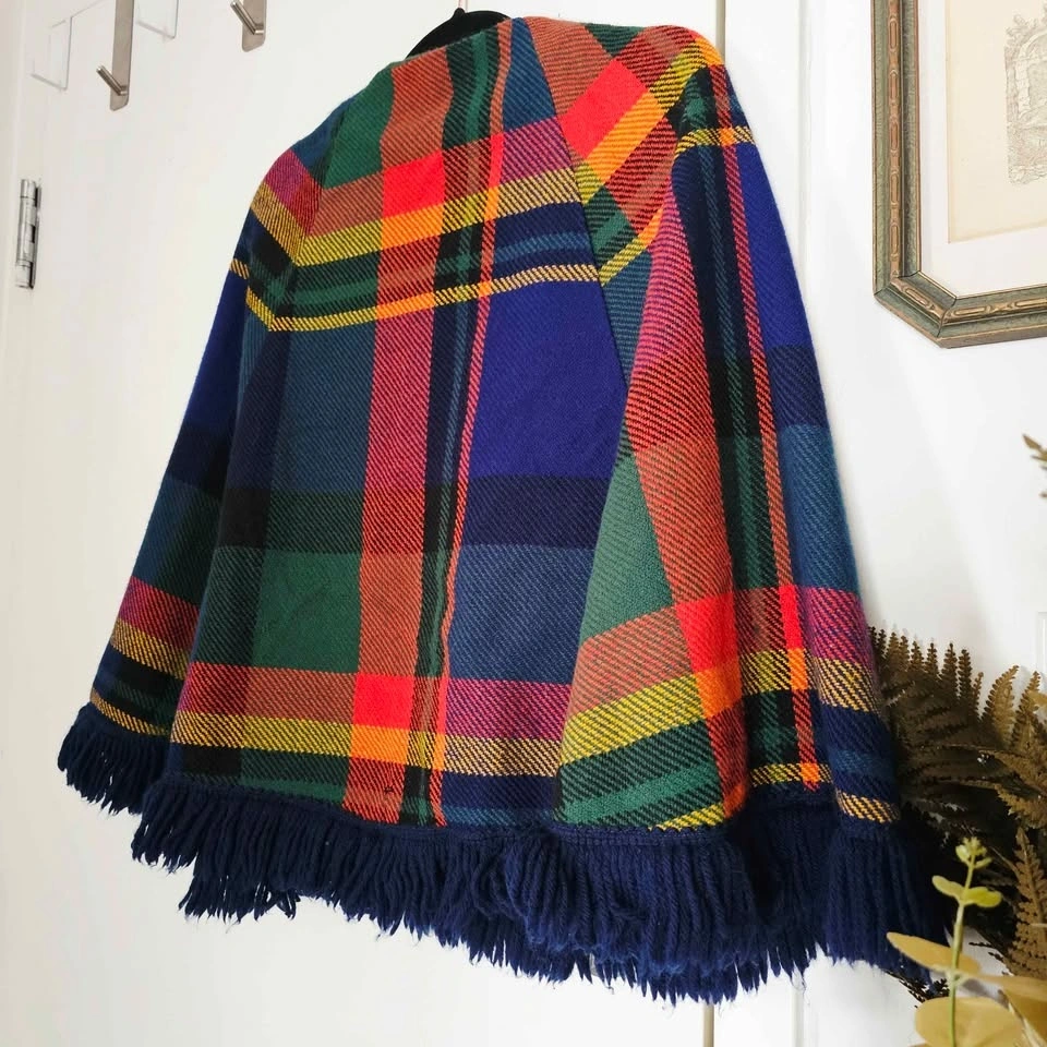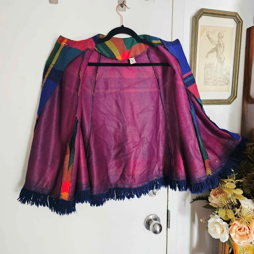 vintage cape 70s outerwear mod coat wool poncho fringe cape folk style statement coat retro plaid cottagecore spring fall transition outerwear boho vintage heritage wool