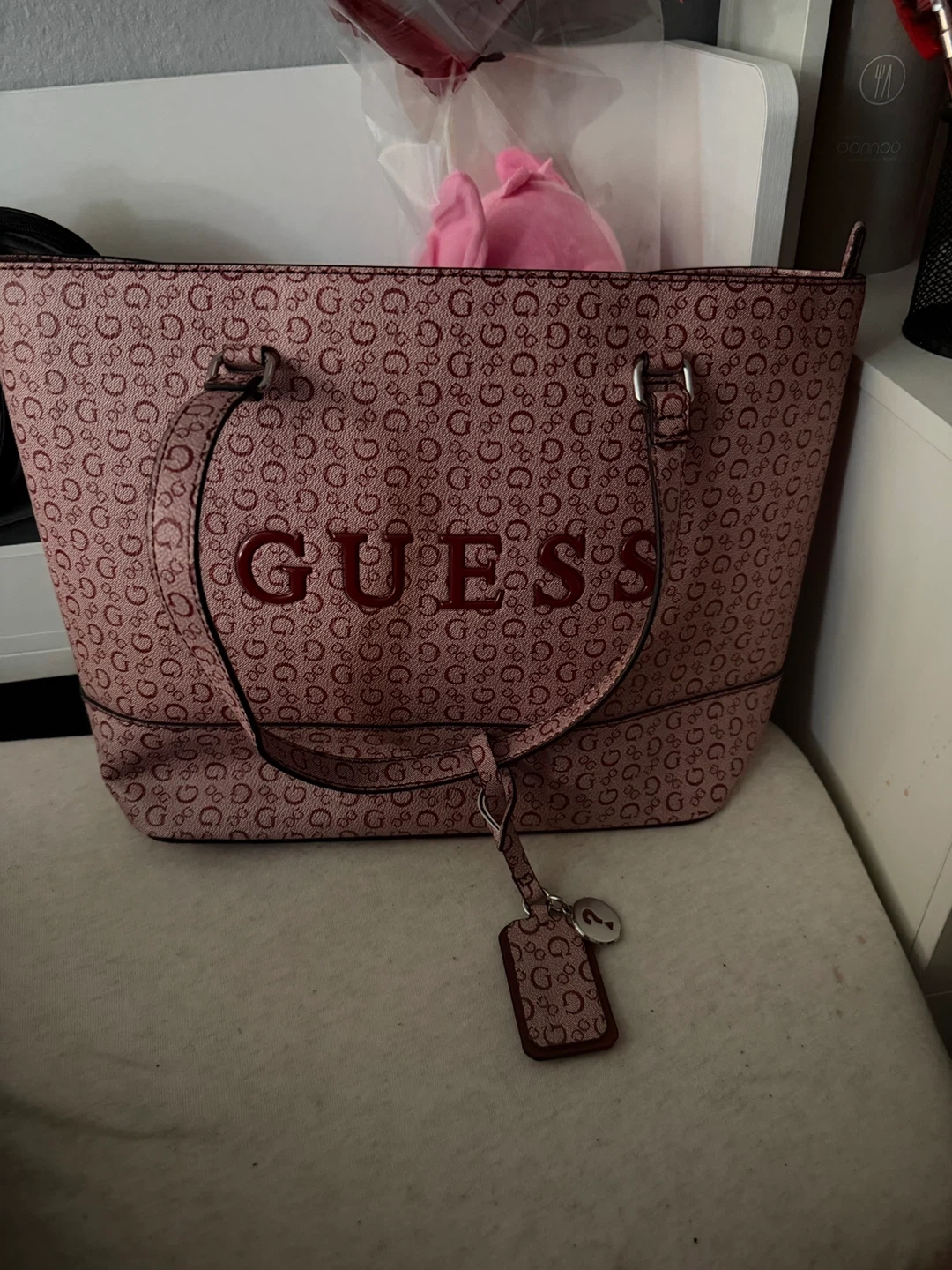 This is a Guess tote bag with the signature 'G' monogram print. It features dual top handles and a tag charm. It's a stylish accessory for everyday use. The bag has a spacious interior for your essentials.