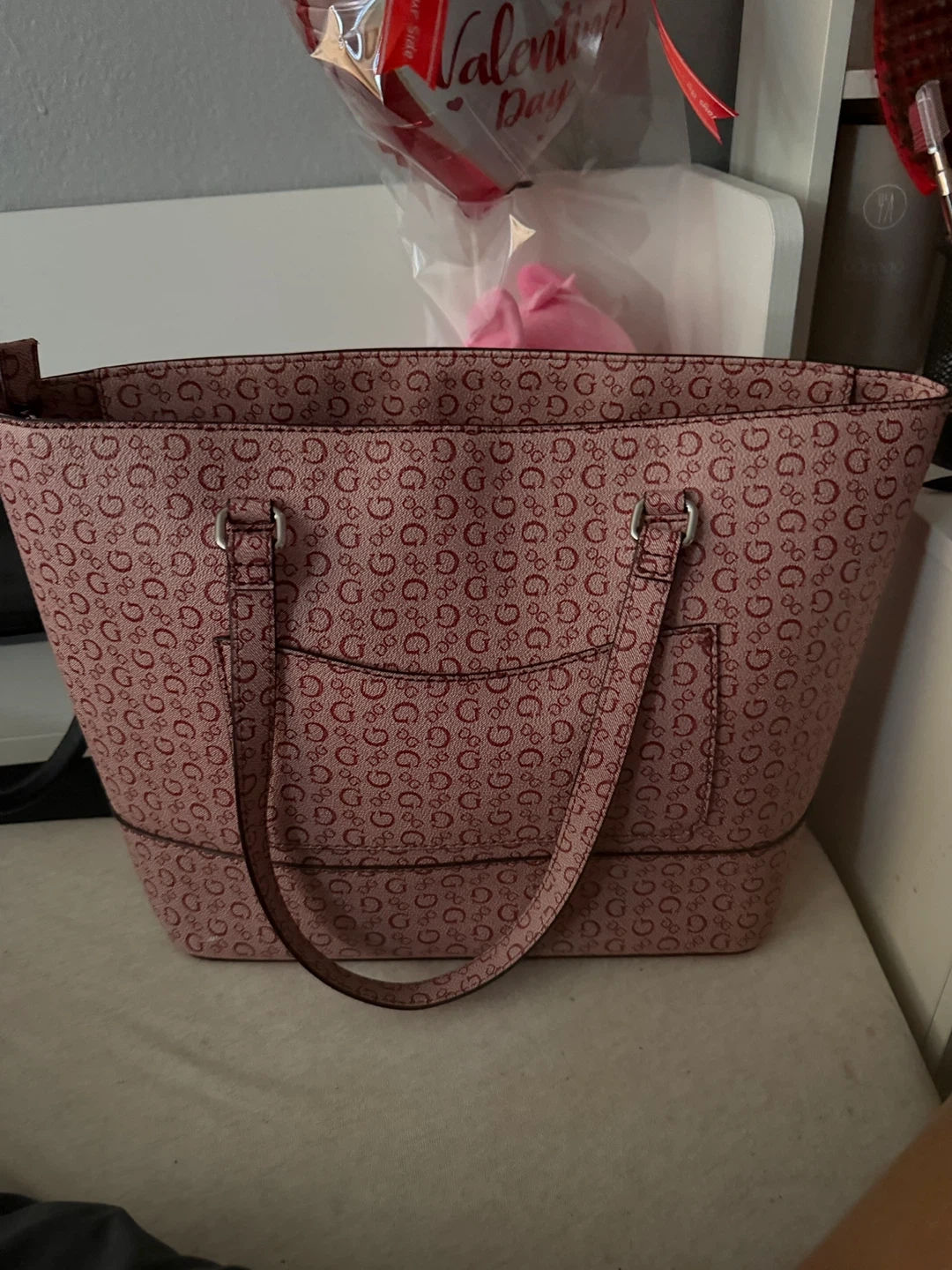 This is a Guess tote bag with the signature 'G' monogram print. It features dual top handles and a tag charm. It's a stylish accessory for everyday use. The bag has a spacious interior for your essentials.