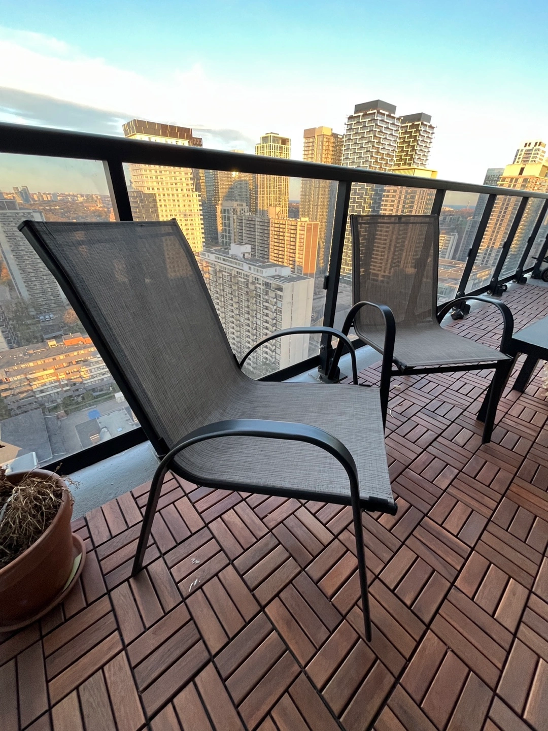 Selling a pair of patio chairs perfect for any balcony, backyard, or outdoor space.