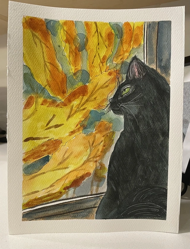 Original 8x10 watercolor painting of a black cat looking out the window, painted by me. It can be framed and makes a great gift. Buy 3 (8x10) paintings and get 1 free. Please see my other paintings.