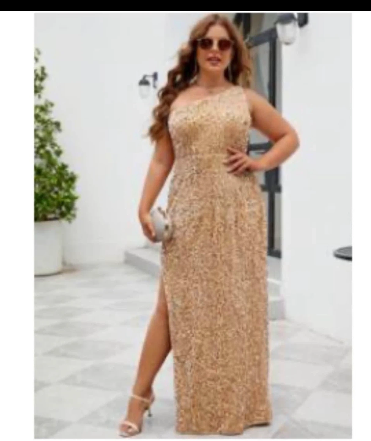 Sparkly gold sequin maxi dress with a one-shoulder design. It features a high slit on the leg. Perfect for a special occasion!