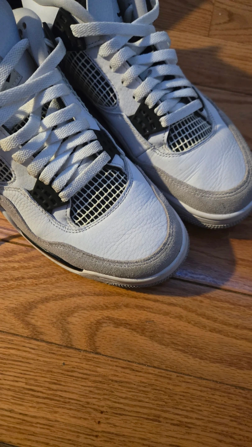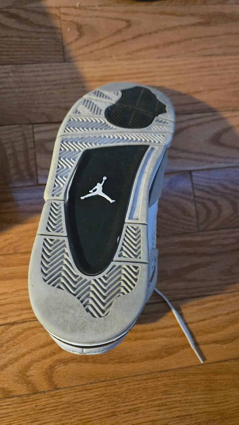 These Air Jordan 4 Retro sneakers come in a classic white and grey colourway. They feature a leather and suede upper with a mesh detail on the sides and tongue. The original box is included. These are a great addition for any sneaker collector!