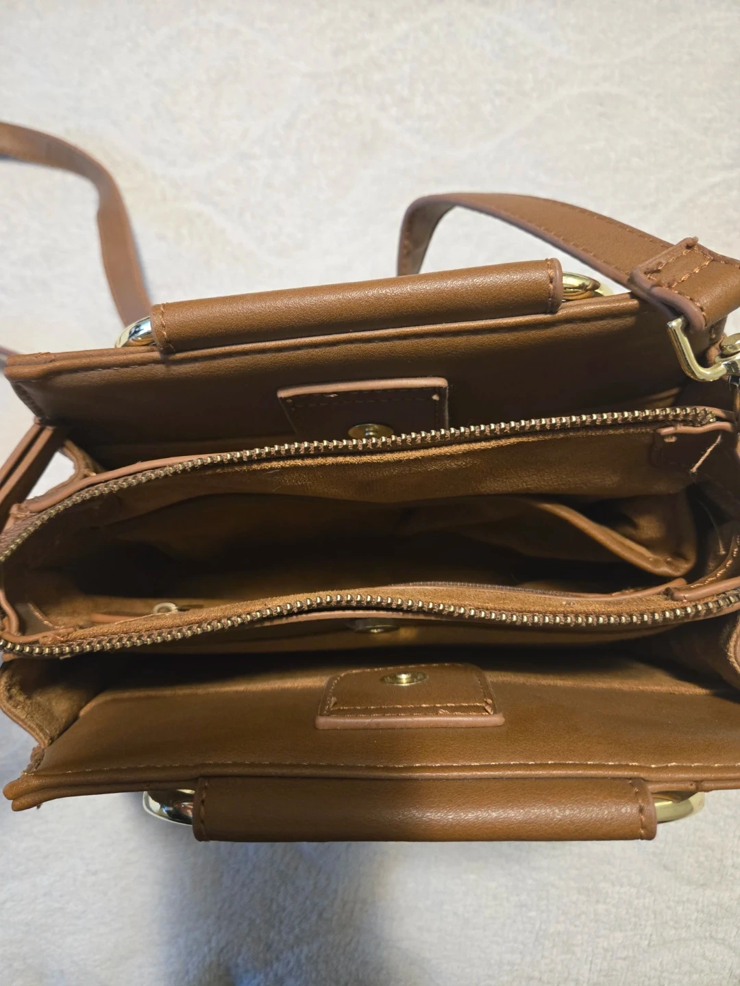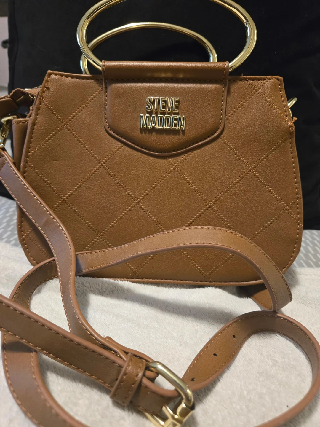 This is a brown quilted satchel handbag from Steve Madden. It features a gold-tone metal ring handle and a removable crossbody strap. The interior has multiple compartments for organization. A stylish accessory for everyday use!