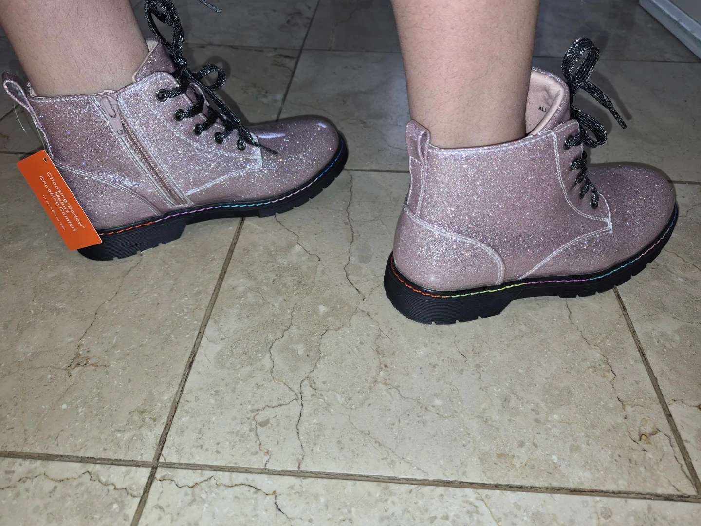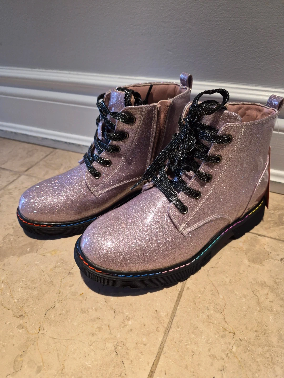 Brand new with tags on! Beautiful sparkly pink combat boots to add some fun to any outfit. They're made from all manmade materials and feature a side zipper for easy on and off. Rainbow stitching adds a pop of colour to the soles. Perfect for making a statement!