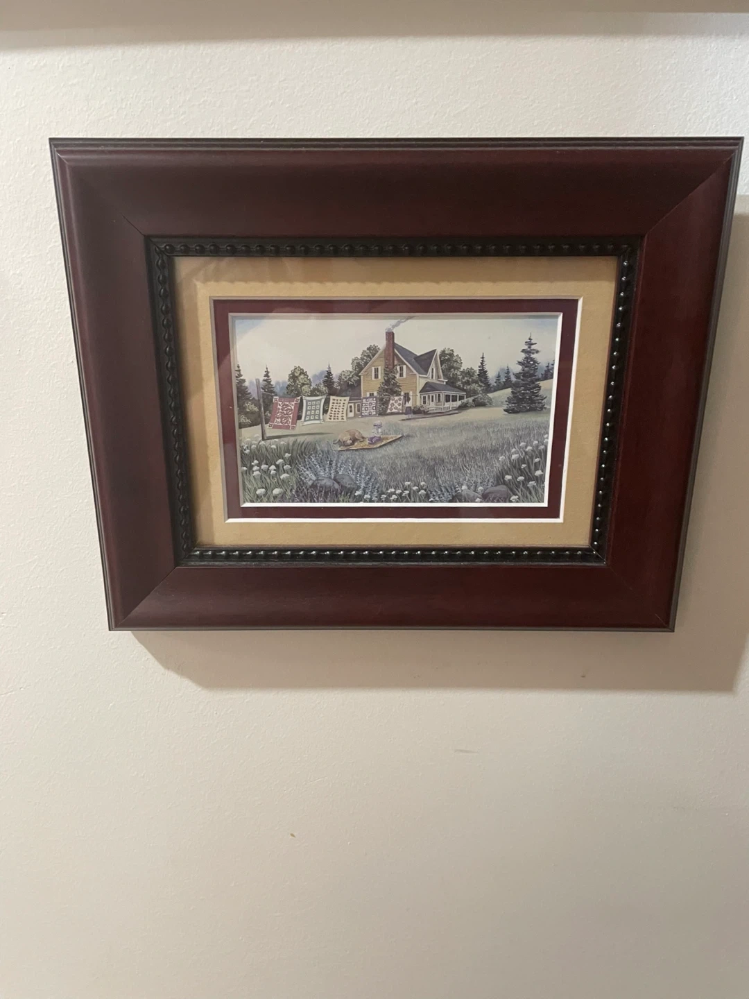 Two framed art prints featuring a nautical lighthouse scene and a country farmhouse with a quilt. Both pieces are matted and housed in dark wood frames. They'd add a touch of scenic charm to any room. The frames have a rich, dark finish cash only please no e-transfers thank you