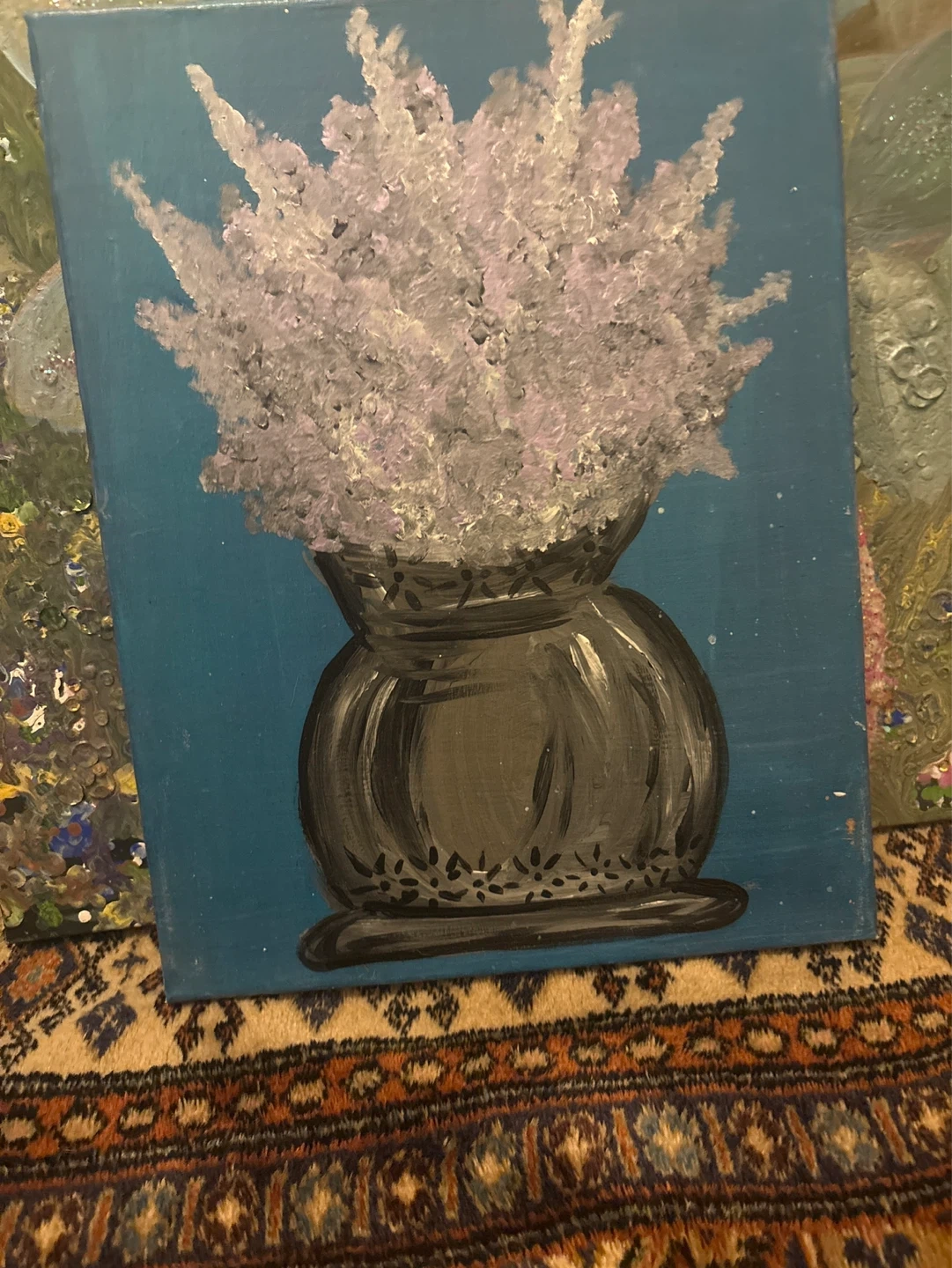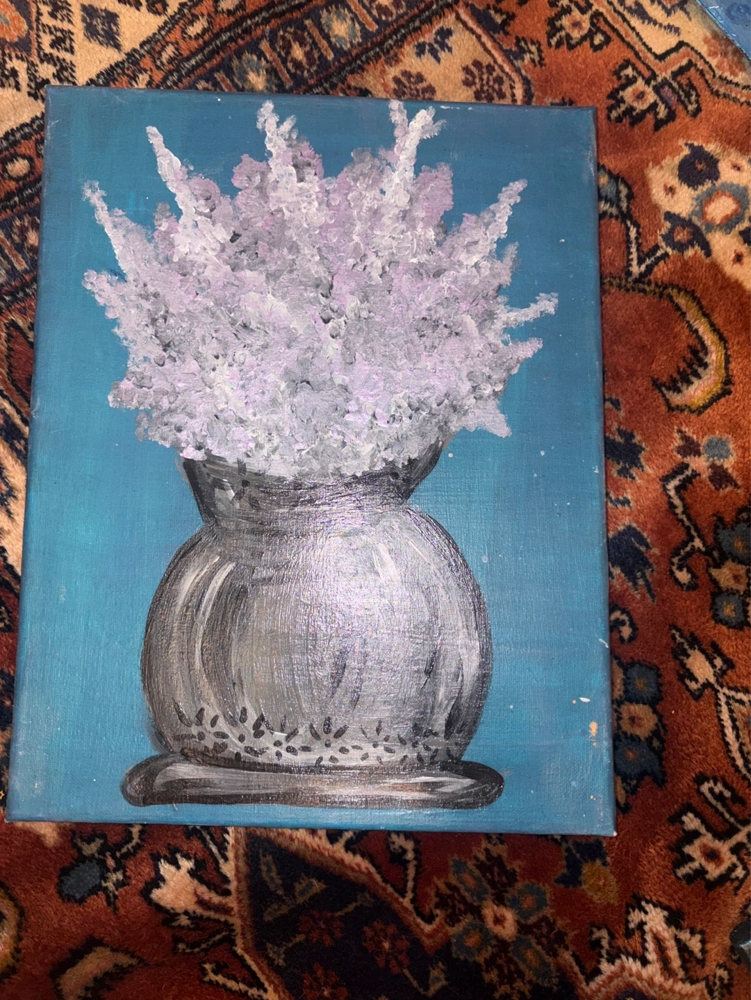 Canvas painting depicting a vase filled with lavender-coloured flowers. The vase is grey and rests on a blue background. Added texture to the flowers.