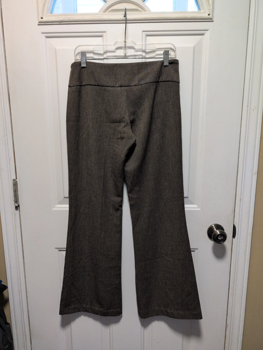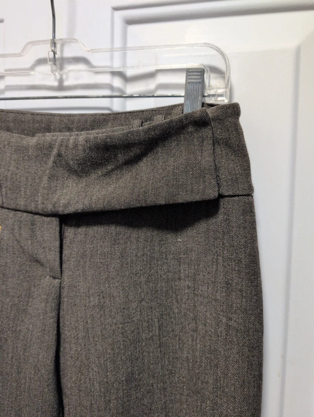These brown dress pants feature a herringbone-style fabric and a stylish folded waistband. They have a comfortable fit and a subtle yellow accent on the pocket. Perfect for work or a night out!