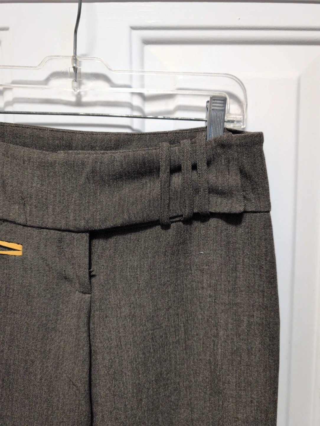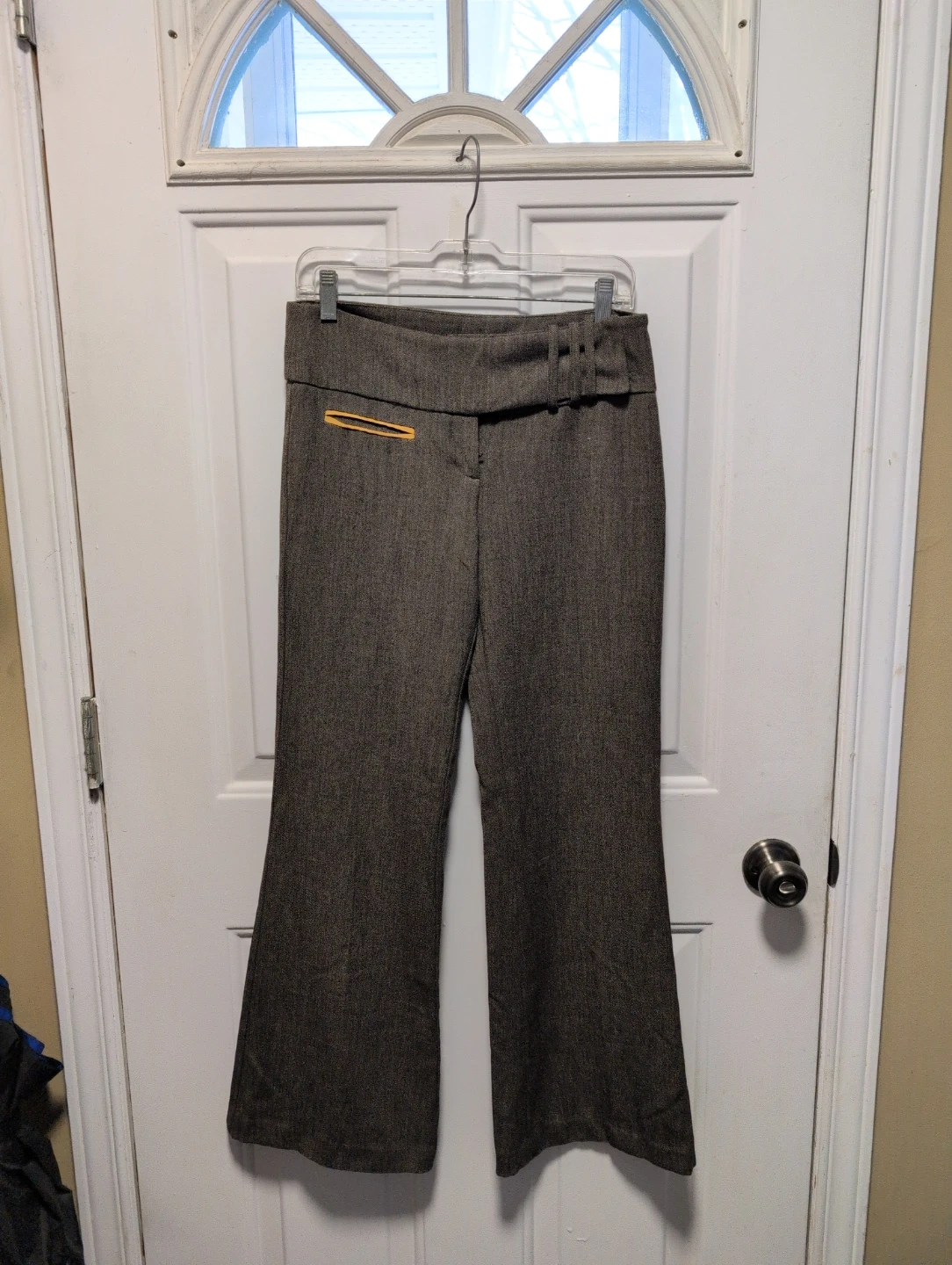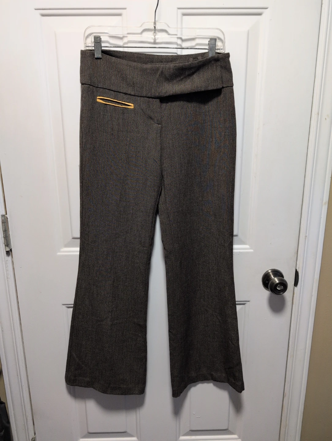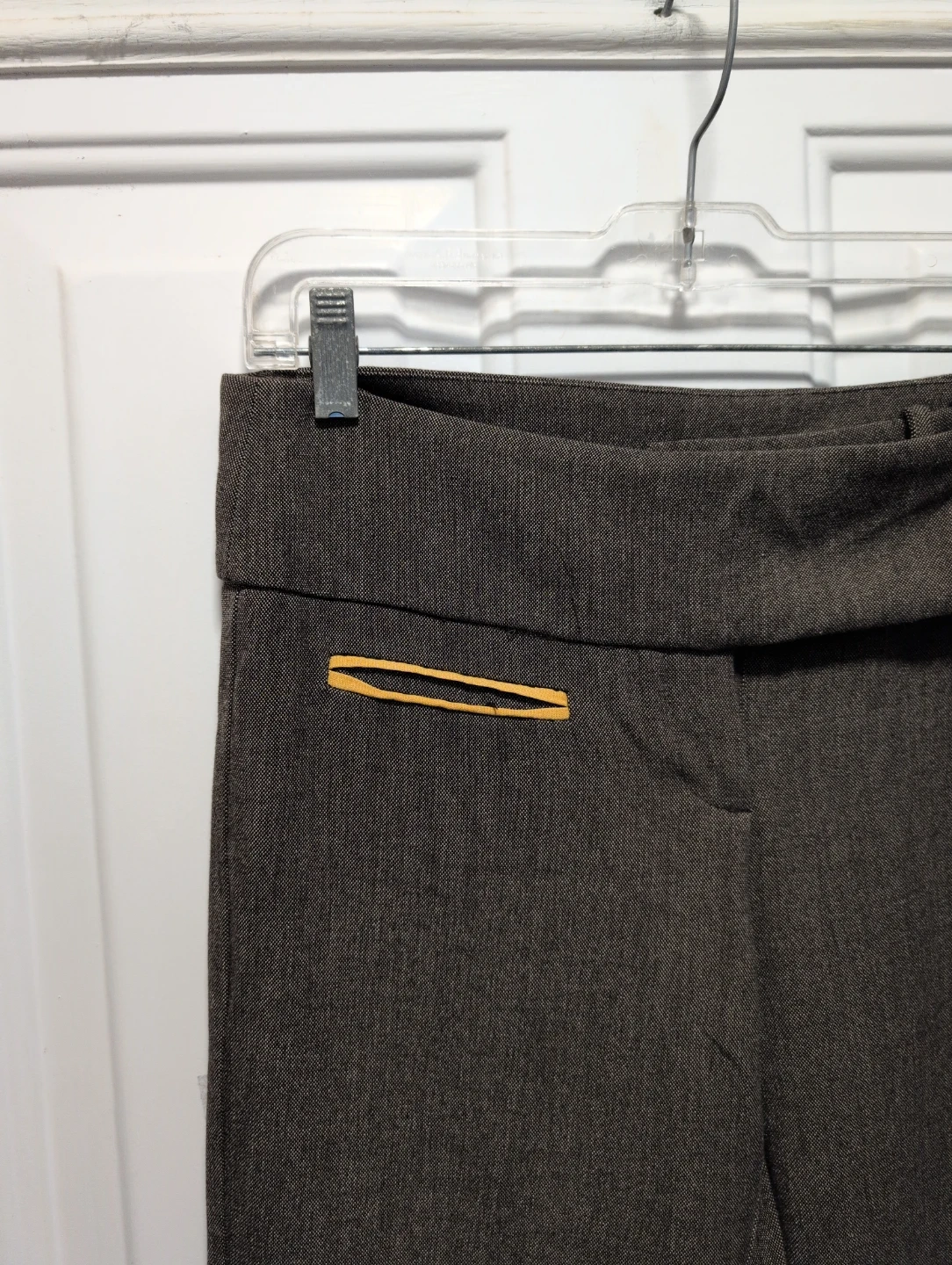 These brown dress pants feature a herringbone-style fabric and a stylish folded waistband. They have a comfortable fit and a subtle yellow accent on the pocket. Perfect for work or a night out!