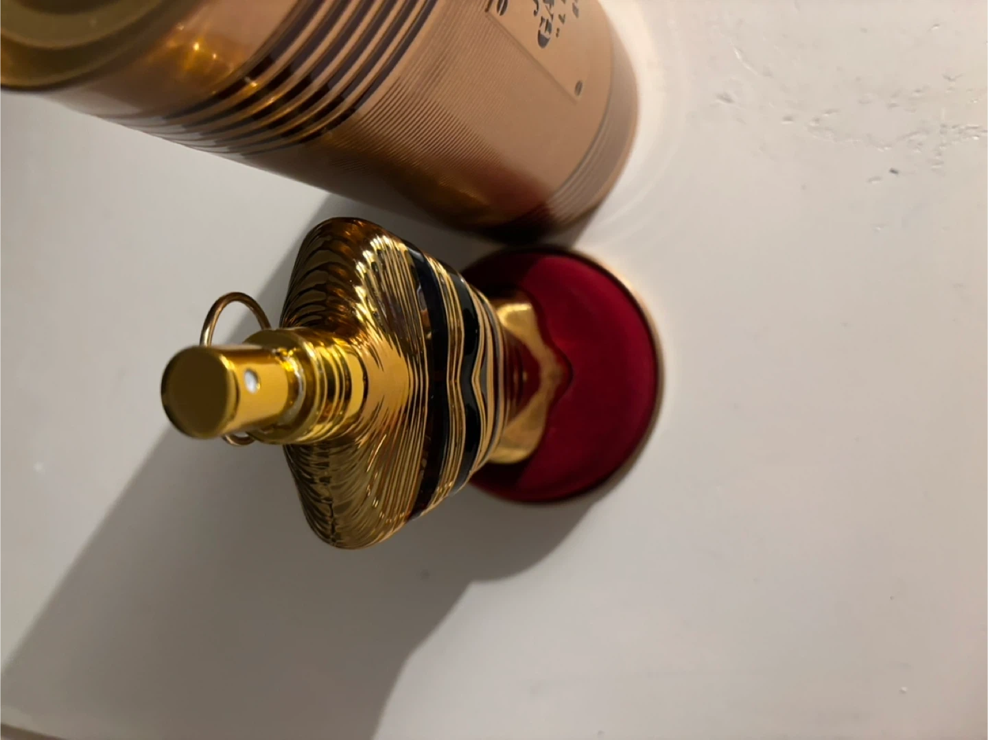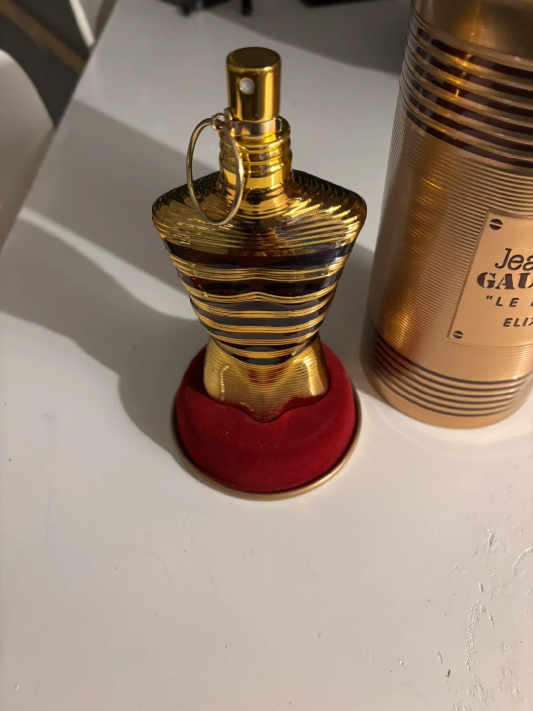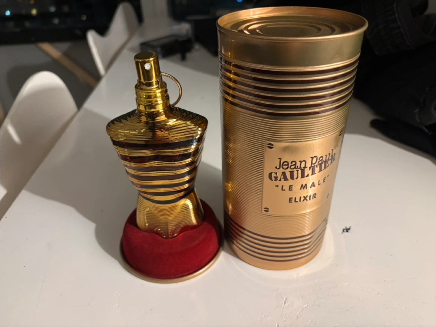Jean Paul Gaultier "Le Male" Elixir Eau de Parfum. This is a striking gold bottle with ribbed detailing and a red velvet base. It's the distinctive body-shaped bottle. Perfect for fragrance collectors!