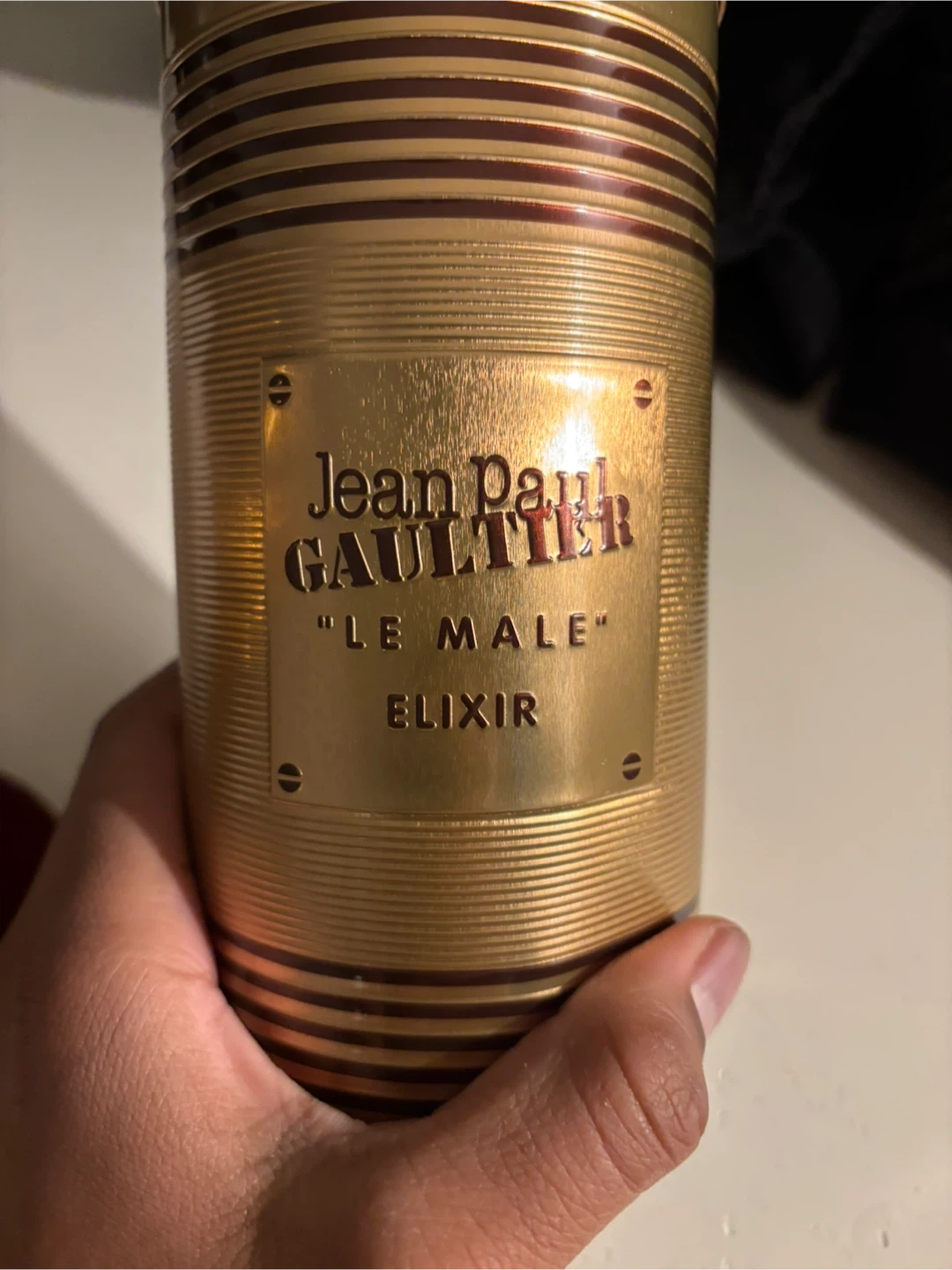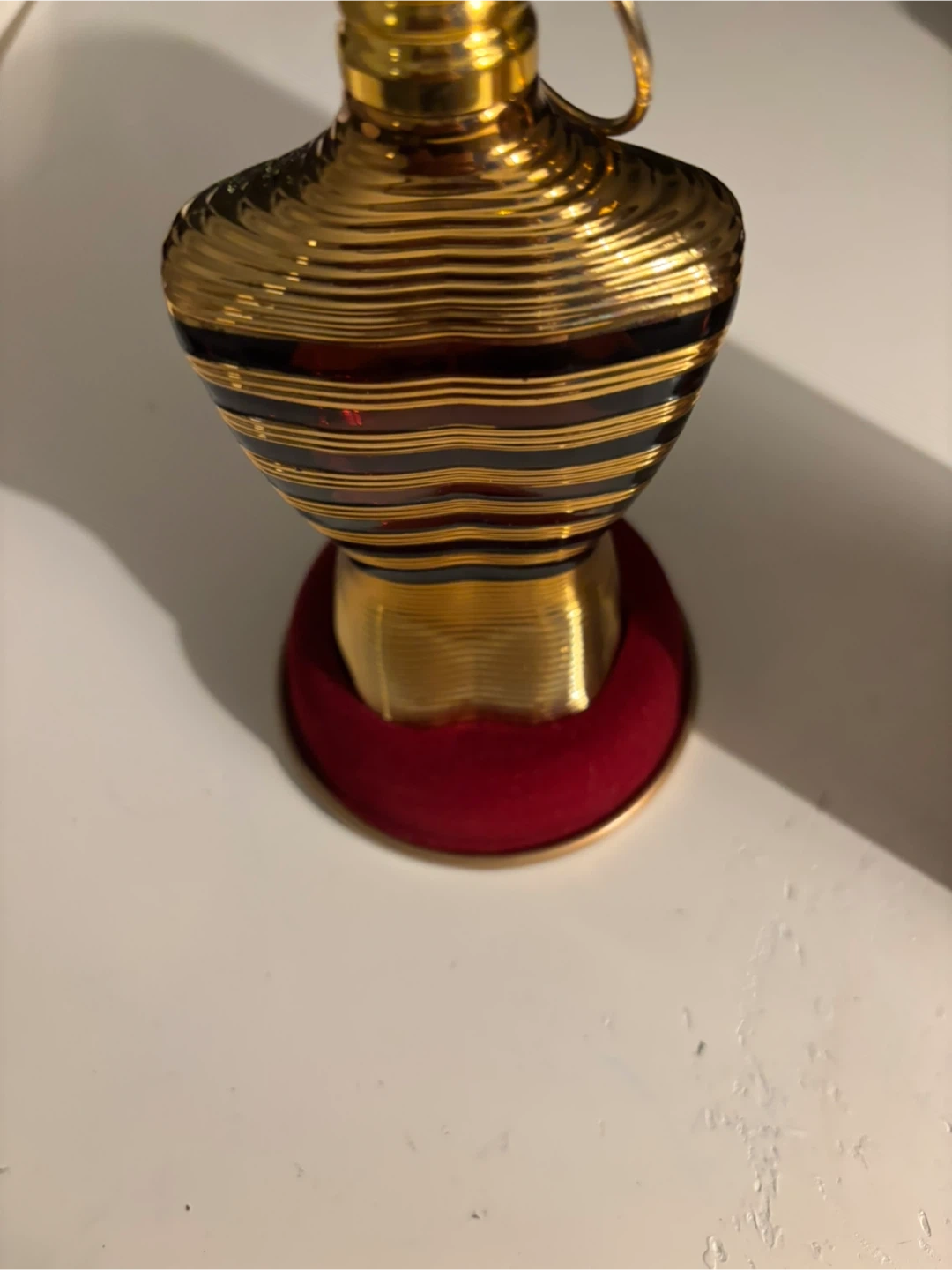Jean Paul Gaultier "Le Male" Elixir Eau de Parfum. This is a striking gold bottle with ribbed detailing and a red velvet base. It's the distinctive body-shaped bottle. Perfect for fragrance collectors!