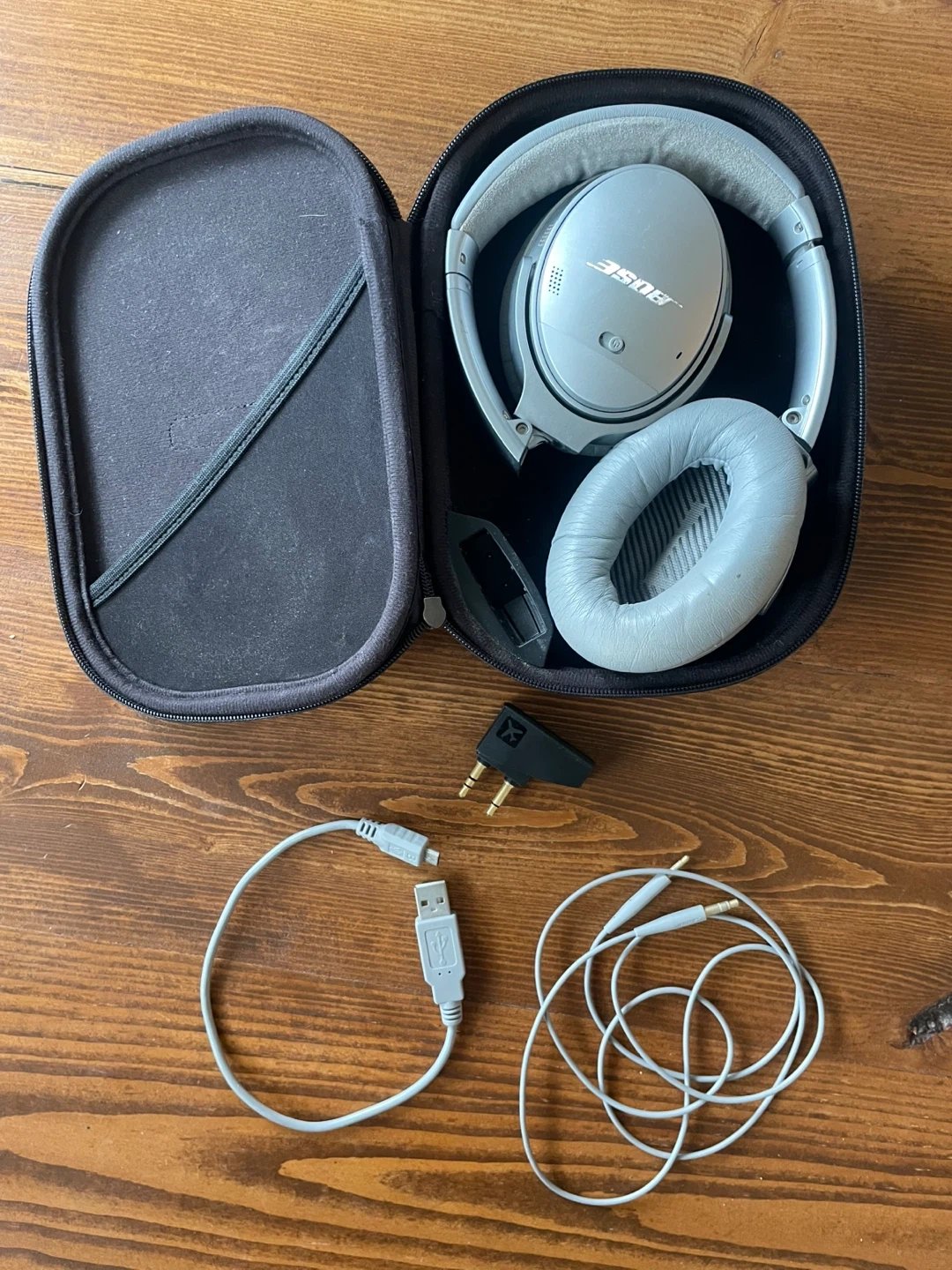 Includes charging cable, audio cable, and an airplane adapter