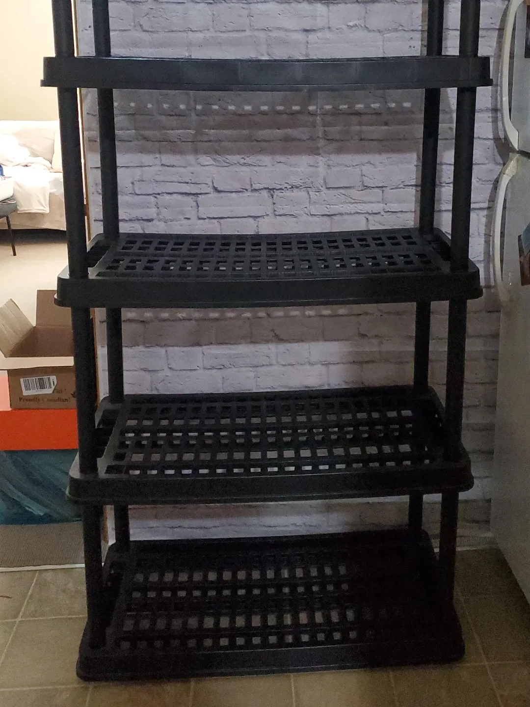 This is a black 5-tier plastic storage shelf unit. It's made of durable plastic and has a grid-style shelving design. Perfect for organizing garages, basements, or workshops!