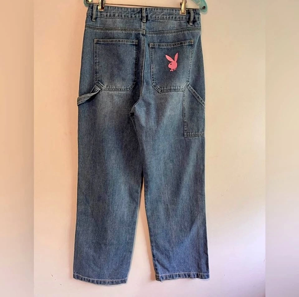 Cute Playboy carpenter jeans in a light wash blue denim. Size 5. Features a super cute pink bunny logo on the back pocket and on the button. Pickup only in the East End of Wasaga Beach.
