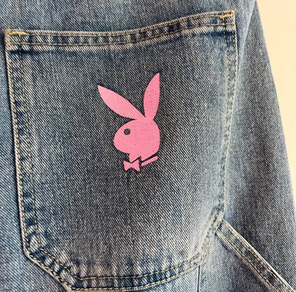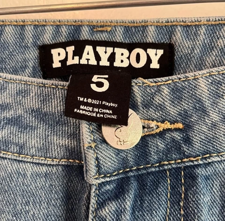 Cute Playboy carpenter jeans in a light wash blue denim. Size 5. Features a super cute pink bunny logo on the back pocket and on the button. Pickup only in the East End of Wasaga Beach.