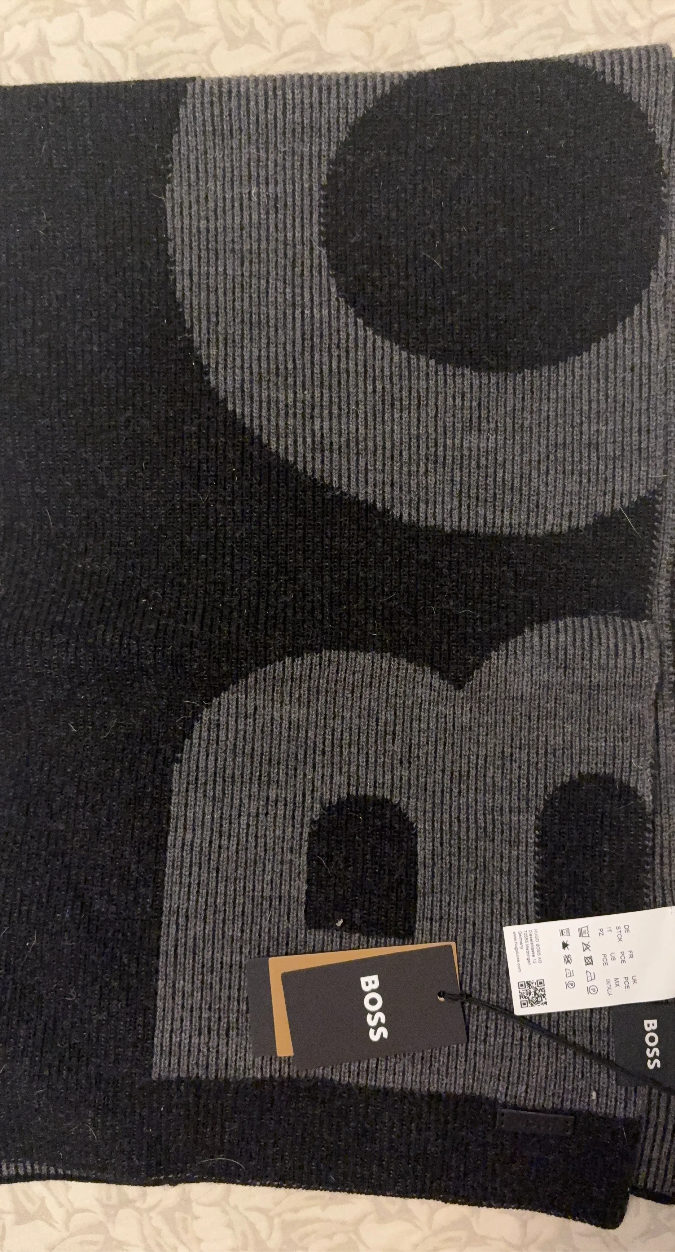 This is a BOSS scarf featuring a large logo pattern. It's made of a knit material in black and grey. Includes original tags.