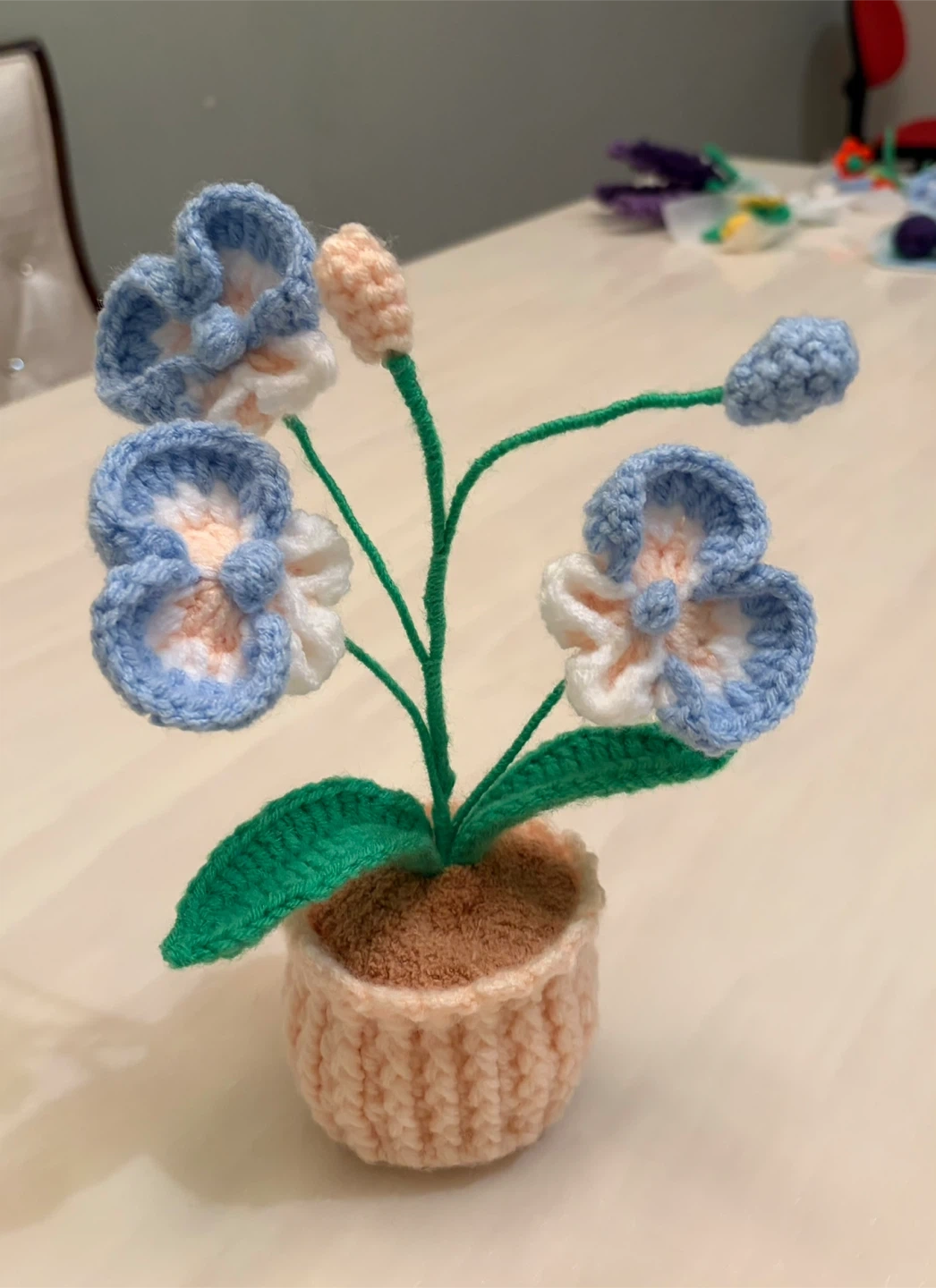 This is a cute, handmade crocheted orchid plant. It features blue and white flowers with a peachy-pink bud and pot. The plant is made of yarn and wire stems. It's a lovely decorative piece for any space!