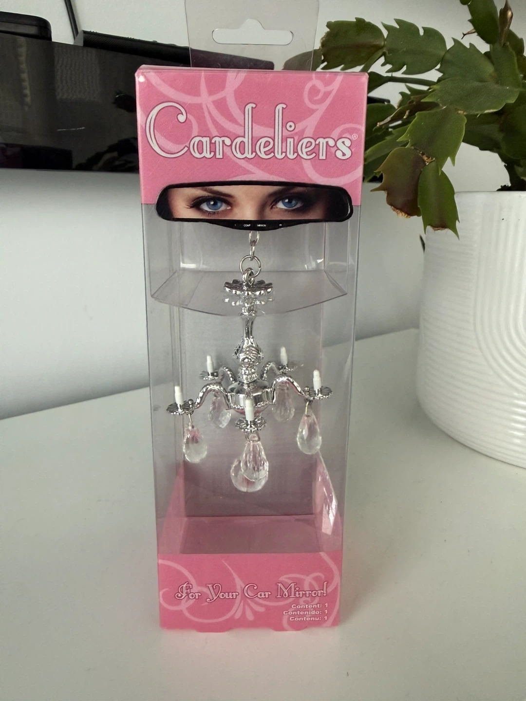 This is a Cardeliers chandelier ornament for your car mirror. It's made with a silver-tone metal and clear crystal-like drops. It's designed to add a bit of sparkle to your vehicle's interior.