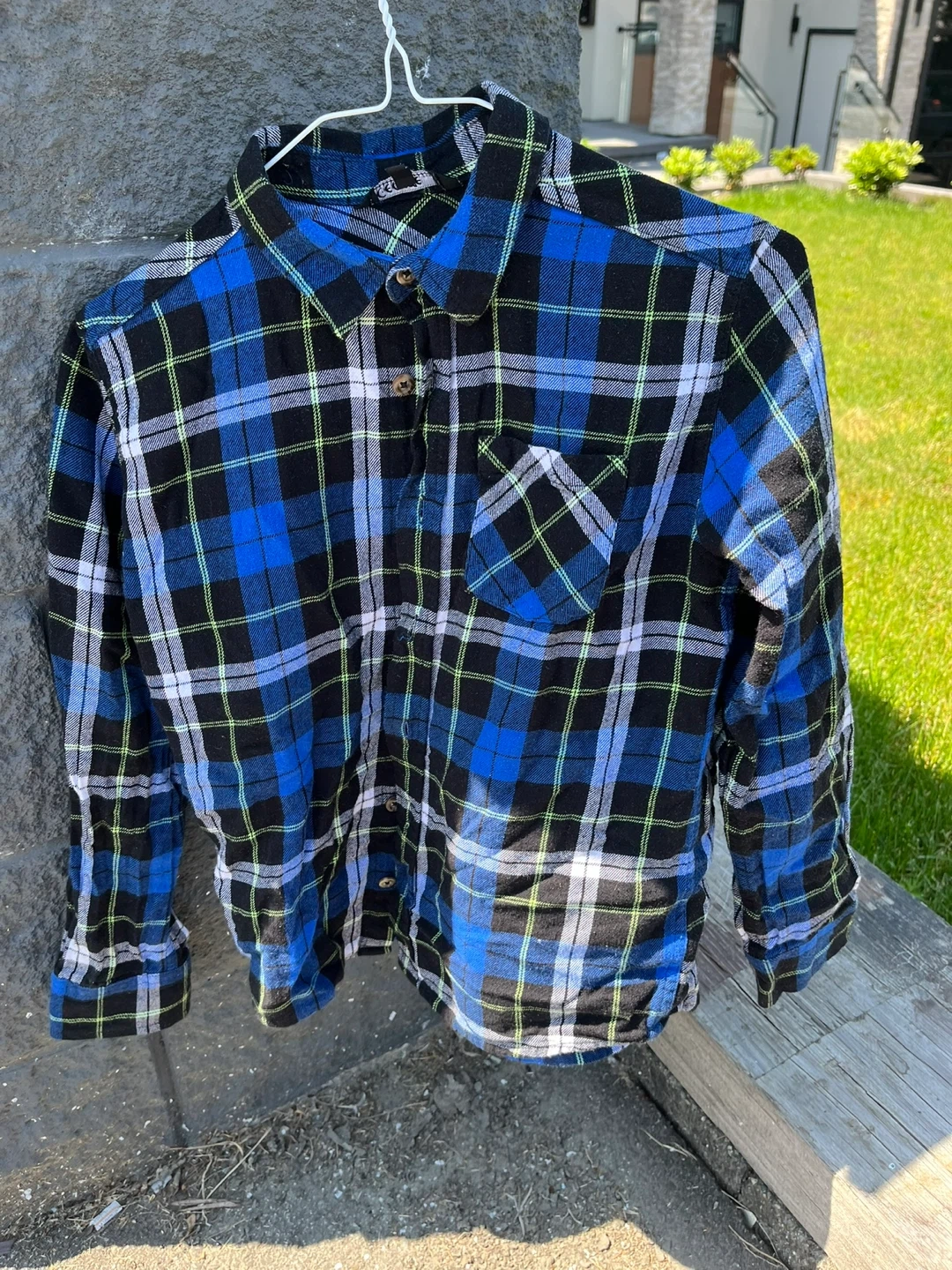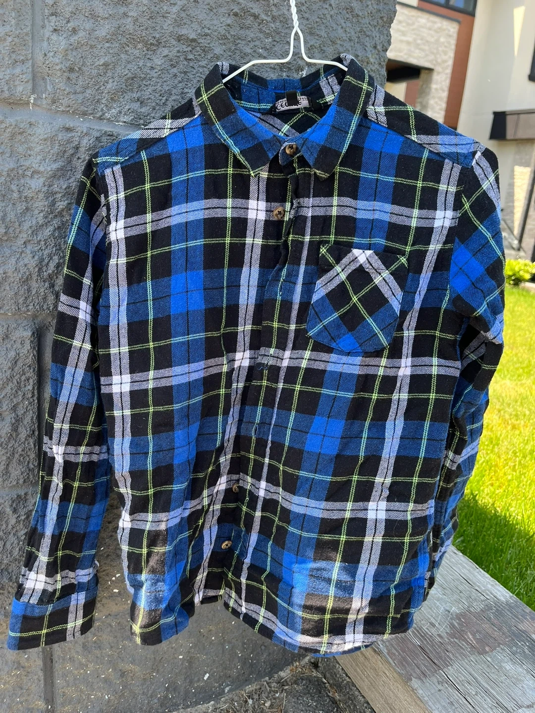 Long-sleeved button-up shirt with a classic plaid pattern. It's made of a soft flannel material. This shirt is perfect for casual wear or layering.