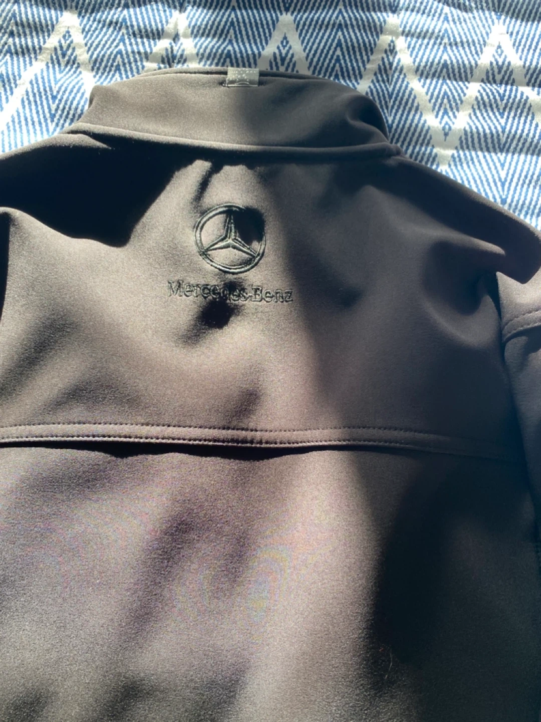 Selling a black jacket with the Mercedes-Benz logo on the back. It's in great condition and ready for a new home!