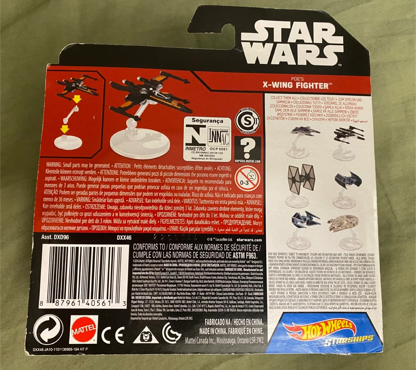 Hot Wheels Starships model of Poe's X-Wing Fighter from Star Wars. It includes a display stand.