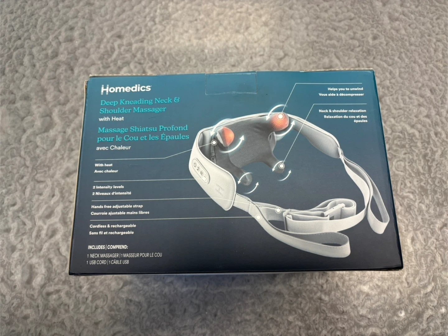 Deep kneading shiatsu massage for your neck and shoulders with soothing heat! It features 2 intensity levels, a hands-free adjustable strap, and is cordless and rechargeable. This massager has a 20-minute auto-off timer for safety. Brand new. Never used.