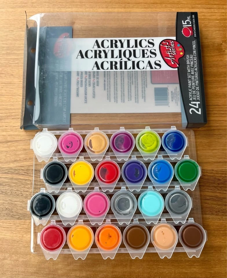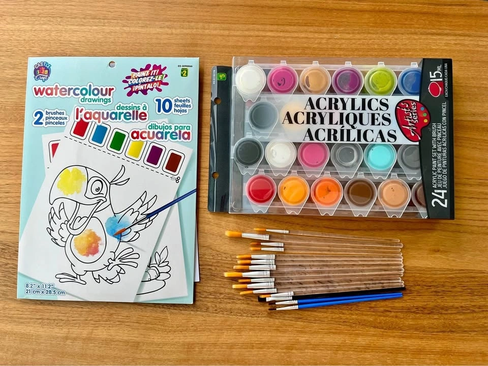 Includes a 24-color acrylic paint set (most barely used), multiple paint brushes in various sizes, and a watercolor activity drawing pad with 7 untouched sheets. Pick up only at 2108 Gilmore Ave, Burnaby.