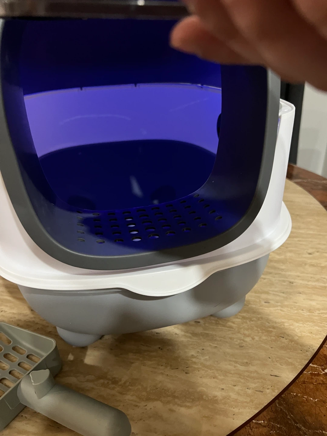 Selling a GROWTH TANK hooded cat litter box in grey. It features a front door flap and a durable removable potty. Comes with a kitty litter tray and a scoop for easy cleaning!
