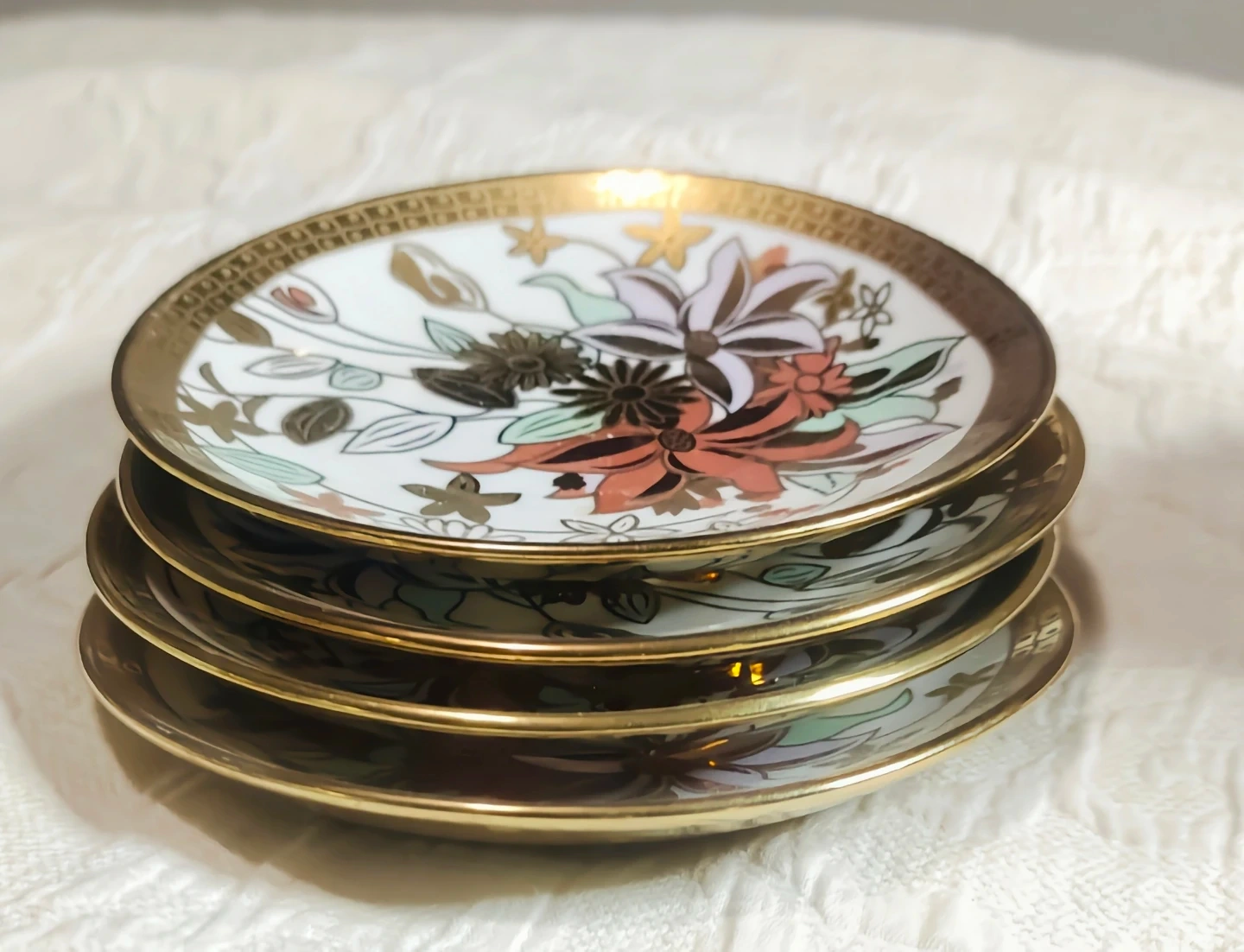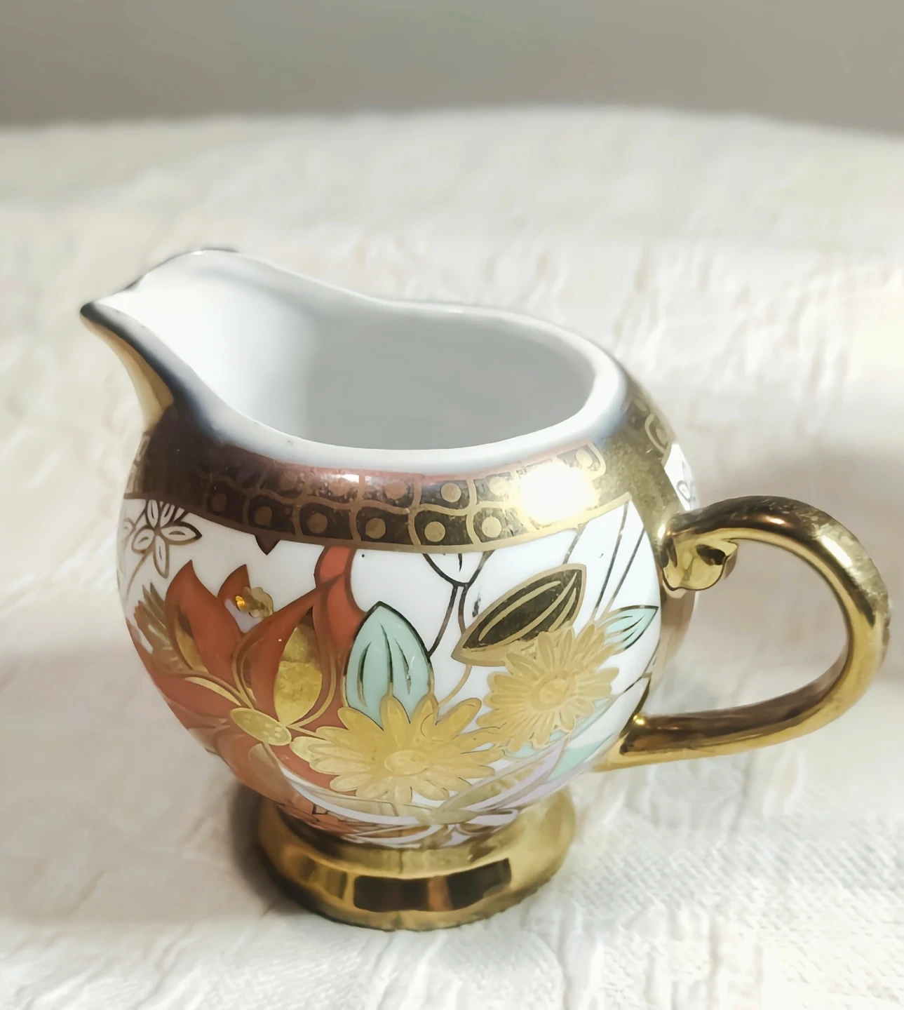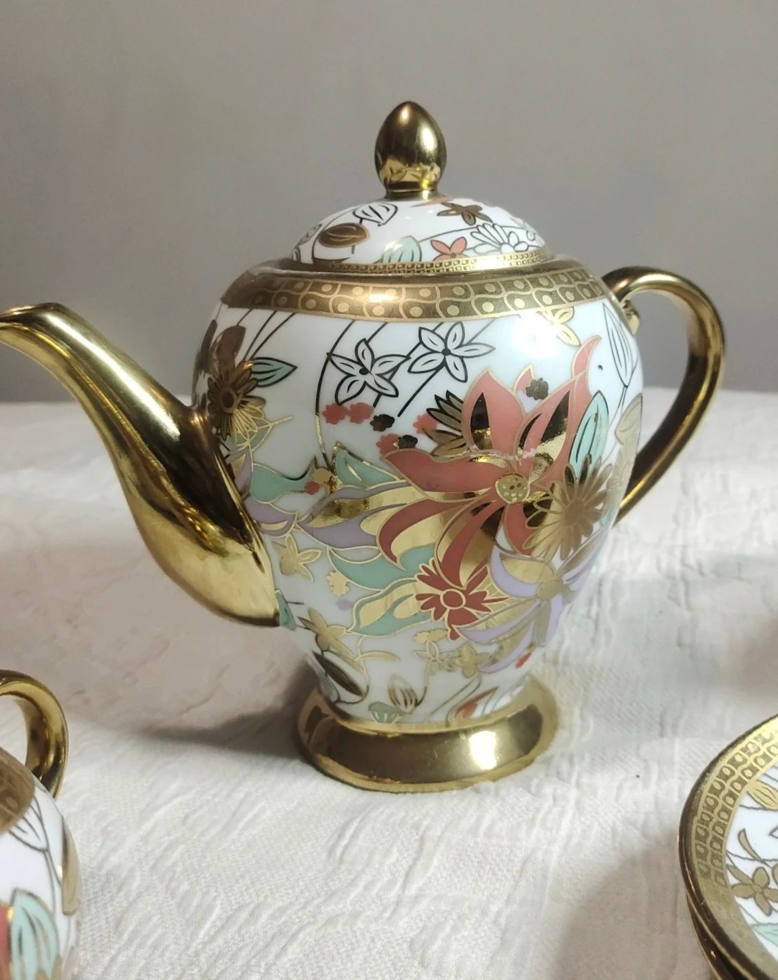 A beautiful JZR fine porcelain teapot set adorned with colourful floral designs and gold trim. This set includes a teapot, a sugar bowl, a creamer, and four saucers. It's perfect for serving tea or coffee to guests.