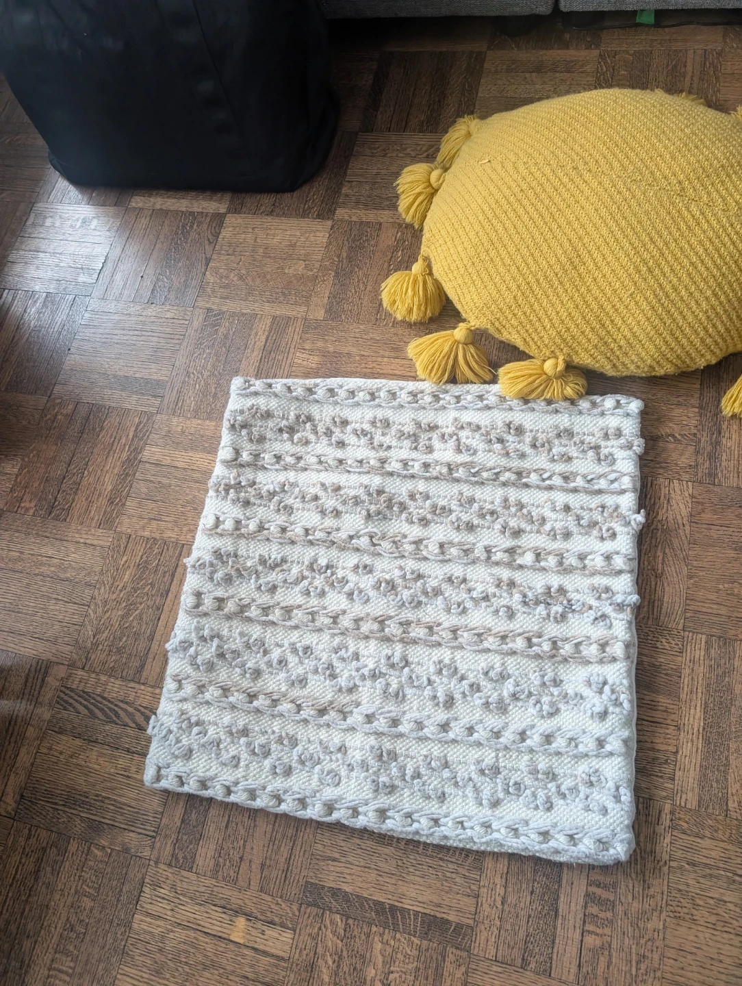 Set of four decorative cushion covers with a boho, textured design. They're made from a woven fabric and include tassels on some of the covers. Covers measure approximately 17x17 inches / 50x50 cm. Include a green cushion pillow and a yellow cushion.
